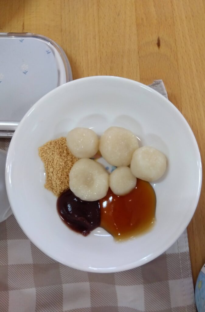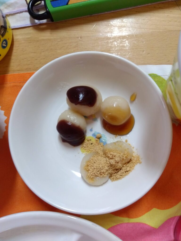 美味しく出来上がったおだんごは、給食の時間に「みたらし・きなこ・あんこ」から味を選び、美味しくいただきました。