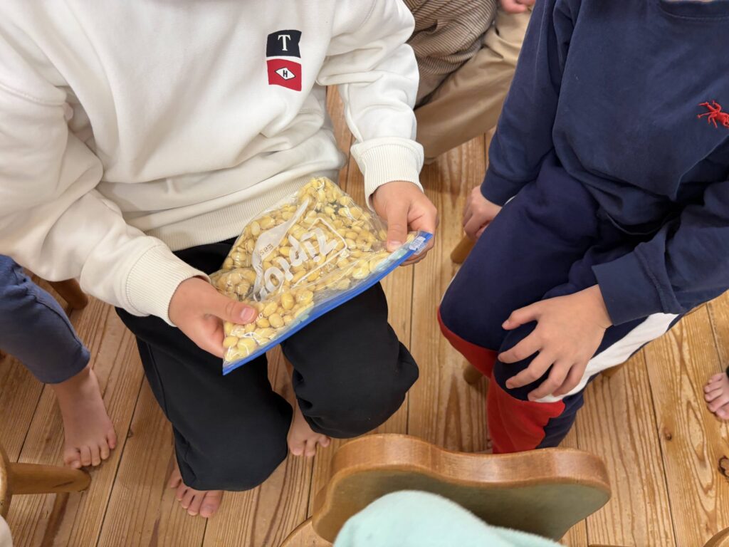 お話を聞いた後は、実際に火を通す前の固い大豆を触り、次に火を通した後の柔らかくなった大豆を触りました。