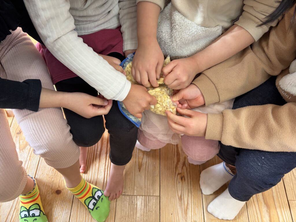 月曜日、そらぐみでは食育としてお豆腐作りを見学しました。