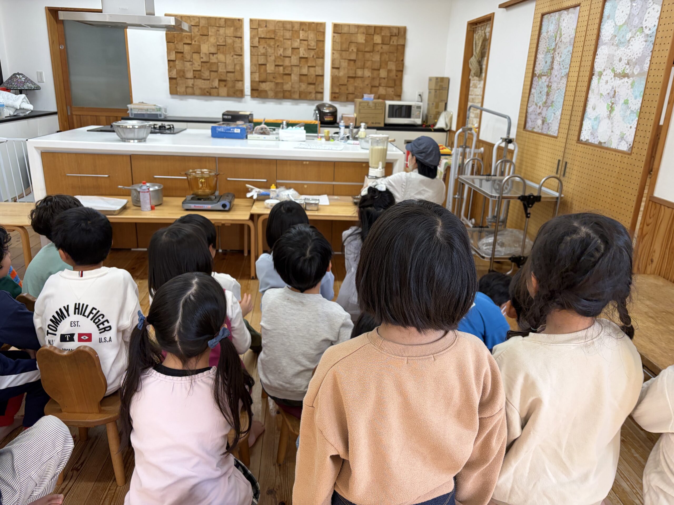 豆乳を火にかけ、温度が上がったらにがりをいれ、豆腐になる準備までを見ることができました。
