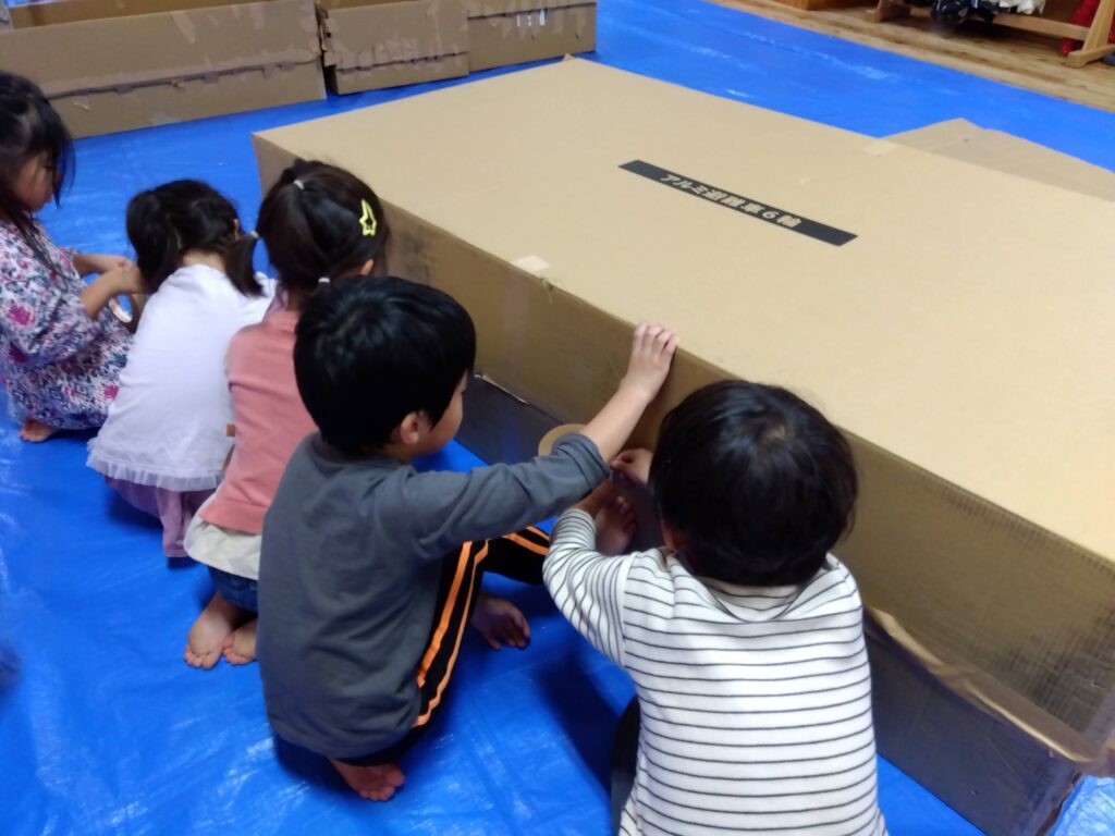 いつもの制作ではなかなか出会わないような大きい段ボールを運ぶにも、組み立てるにもみんなの力が必要です。