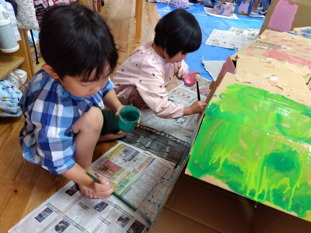 何色を塗りたいかグループで考え、大きい段ボールにみんなでえのぐを塗っていきます。