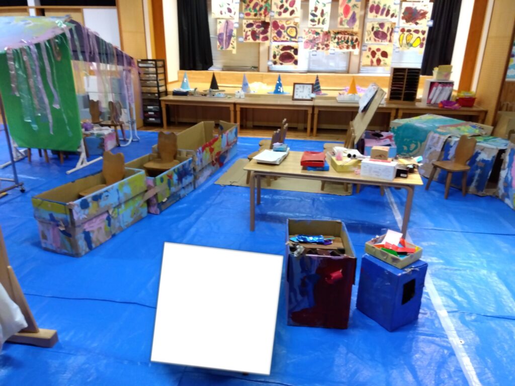 そして今回作品展では、小さい箱やテープや筒などを見合わせて制作をとっても楽しんでいるそらぐみさんに、「みんなで大きい段ボールとかも使って魔法の国をみんなで作らない?」と提案すると、「よっしゃー!!」と大喜びの子どもたちでした。