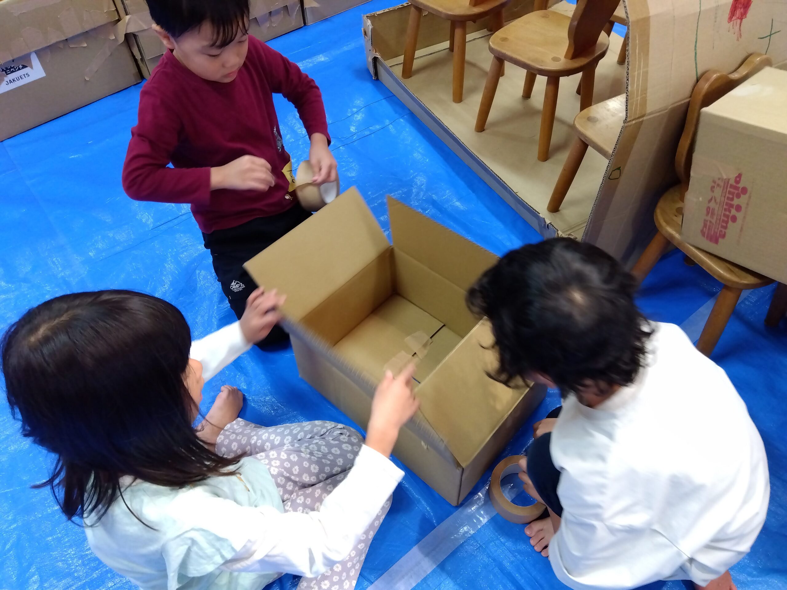 いつもの制作ではなかなか出会わないような大きい段ボールを運ぶにも、組み立てるにもみんなの力が必要です。