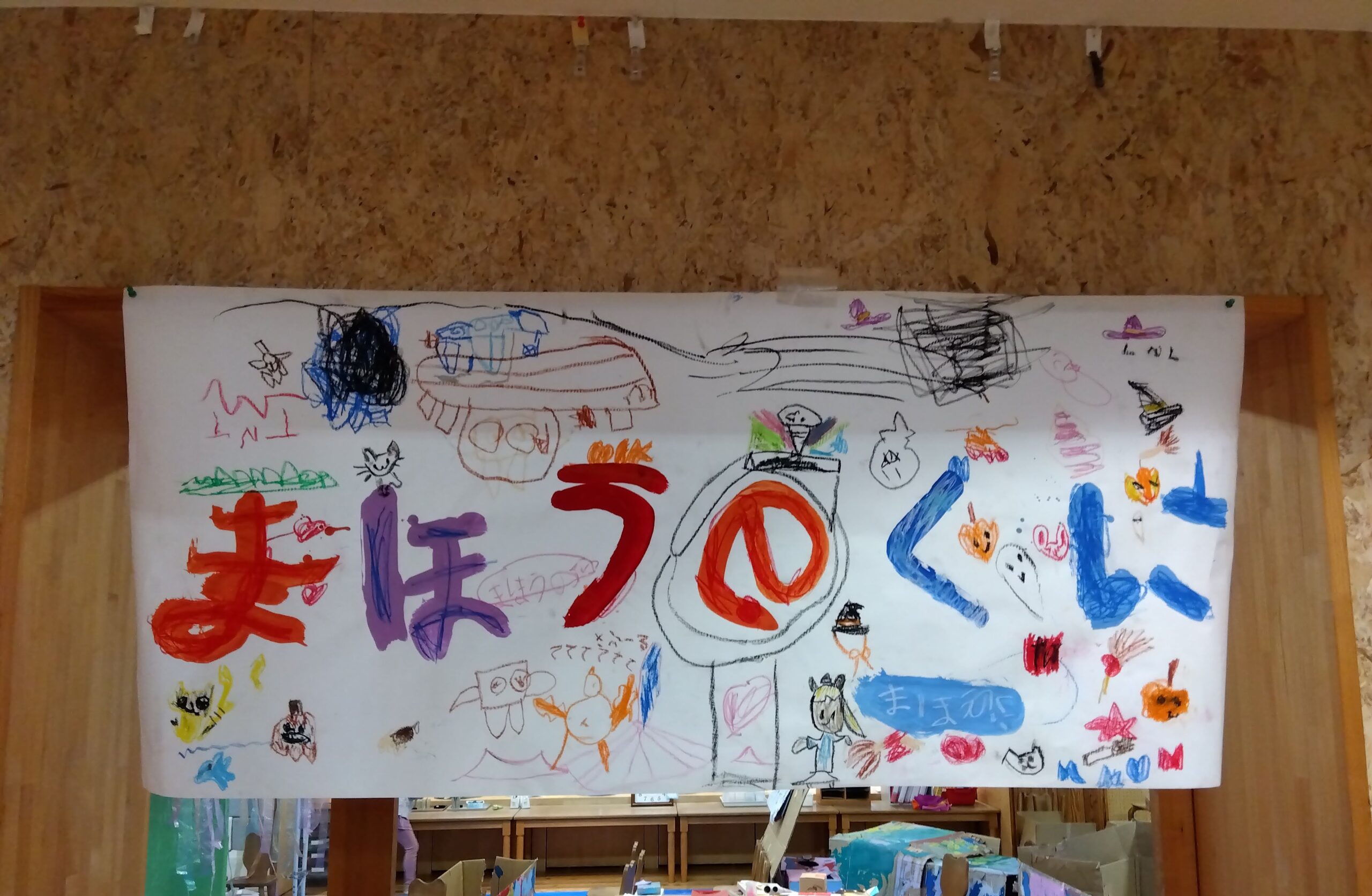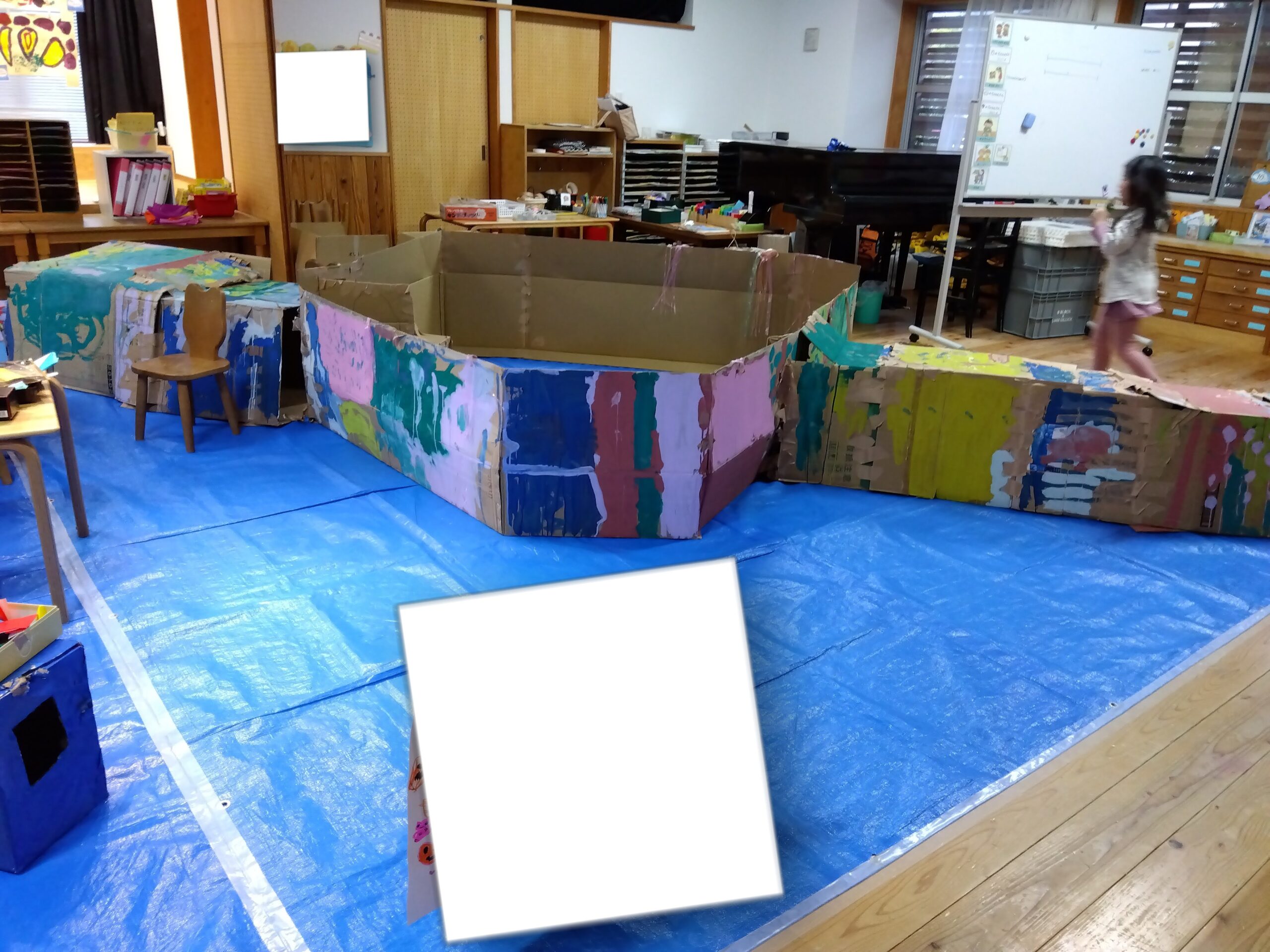 そして今回作品展では、小さい箱やテープや筒などを見合わせて制作をとっても楽しんでいるそらぐみさんに、「みんなで大きい段ボールとかも使って魔法の国をみんなで作らない?」と提案すると、「よっしゃー!!」と大喜びの子どもたちでした。
