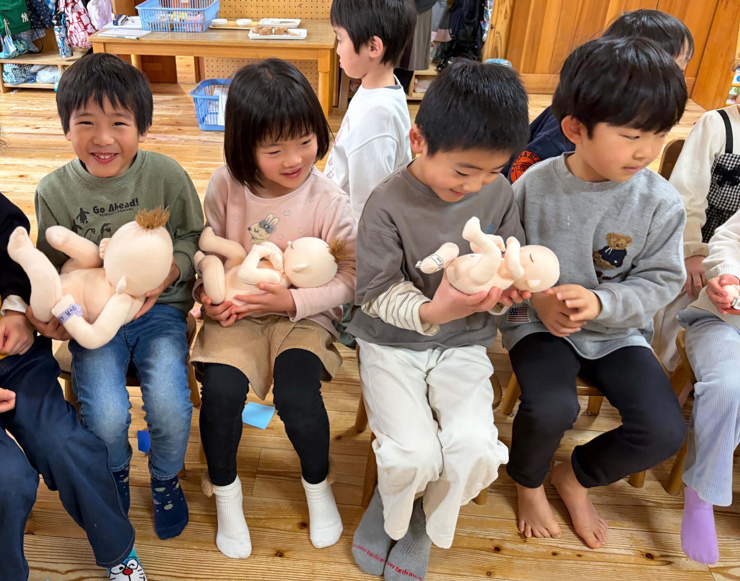 少しずつお腹の中で大きくなっていく赤ちゃんの大きさ・重さの人形を抱っこするみんなの手や表情がとても優しく、「わぁー、こんなに小さいんだ」「妹抱っこしたことあるよ」とそれぞれ様々な感想をもったようです。