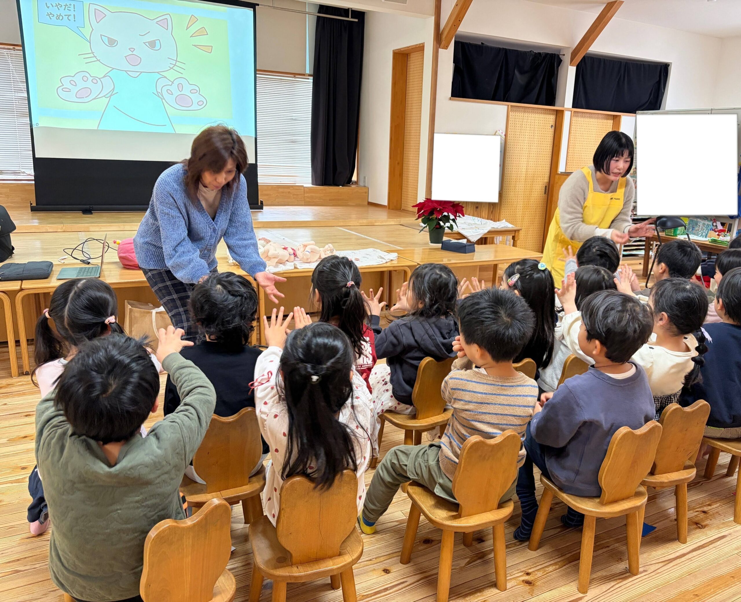 さっそく「やめて!ダメ!」と手を前に出して言う練習をすると、とても上手にみんな言えていました。