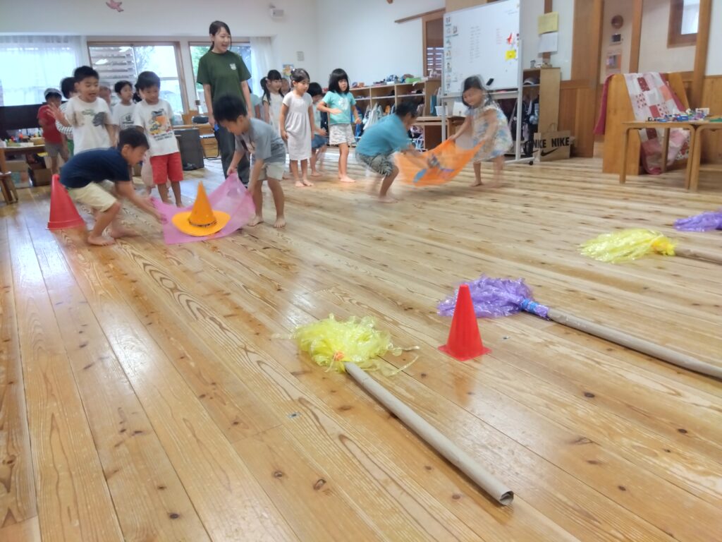 「こうたい!」「まるくなるよ〜」と先生役になる子もいて、繰り返し楽しんでいます。最初は見られることに緊張していましたが、通りがかりの先生にも「みていって!」というほど自信がついてきたみたいです。