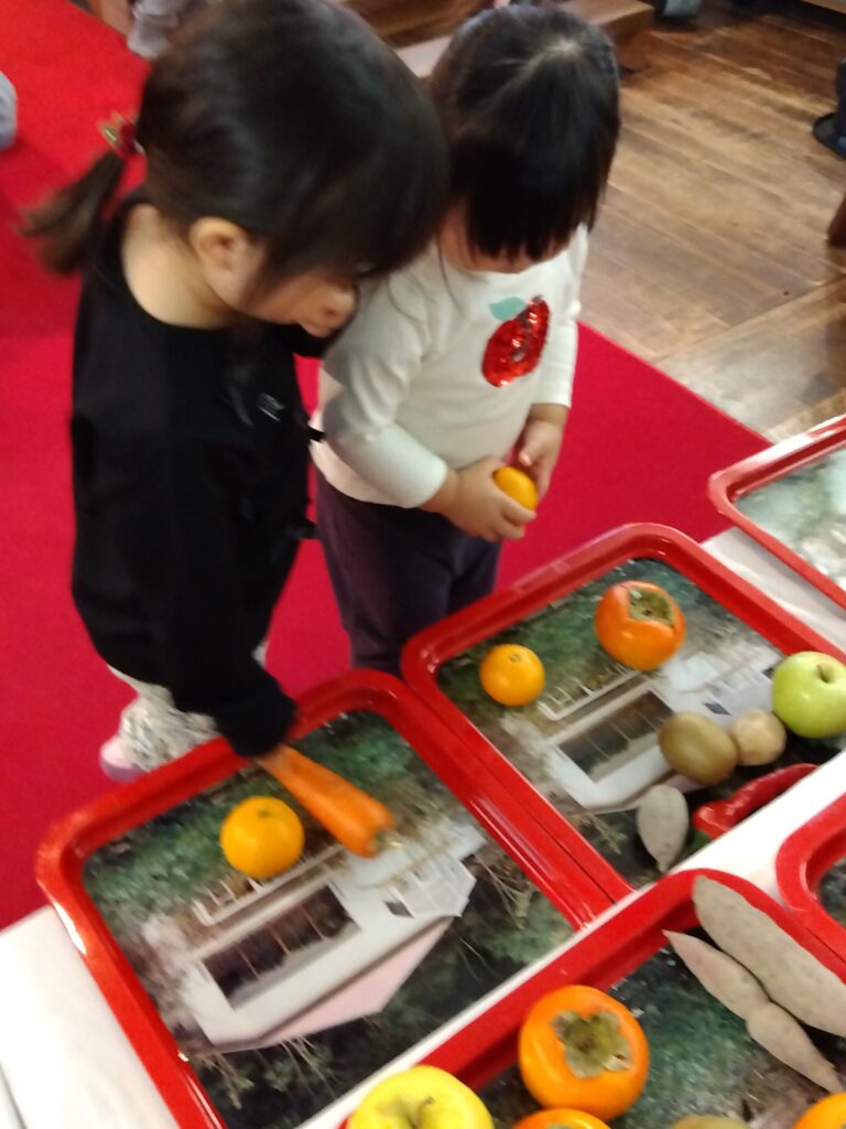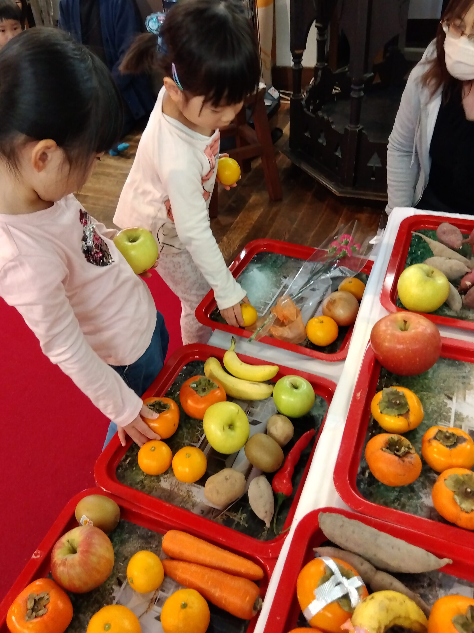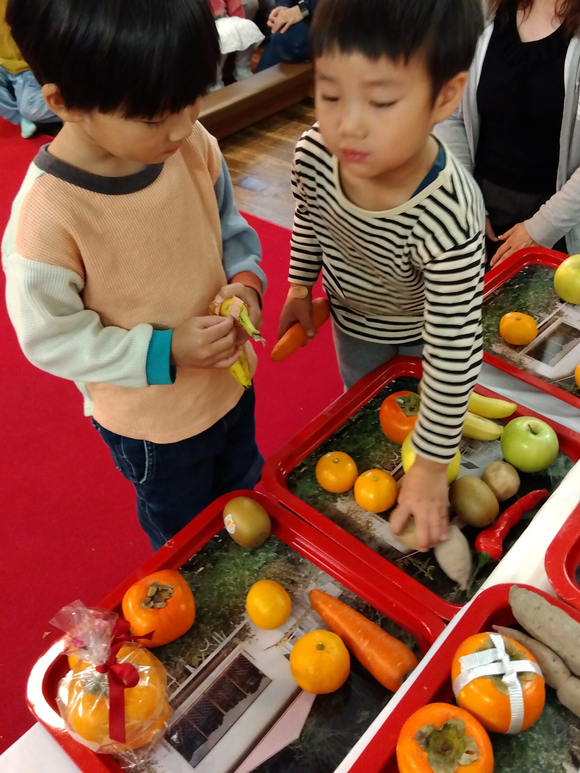 礼拝中、お話の中で吉田先生から「このたくさんの食べ物や自然、恵みは誰が作ってくれたのかな?」との問いに、「畑でお世話する人!」「太陽のひかり!」「神さま!」と先生もびっくりな回答をする子どもたちでした。