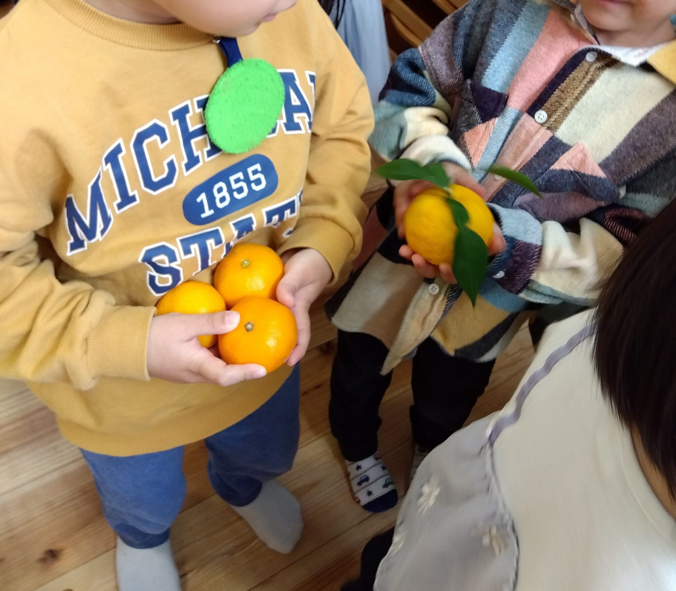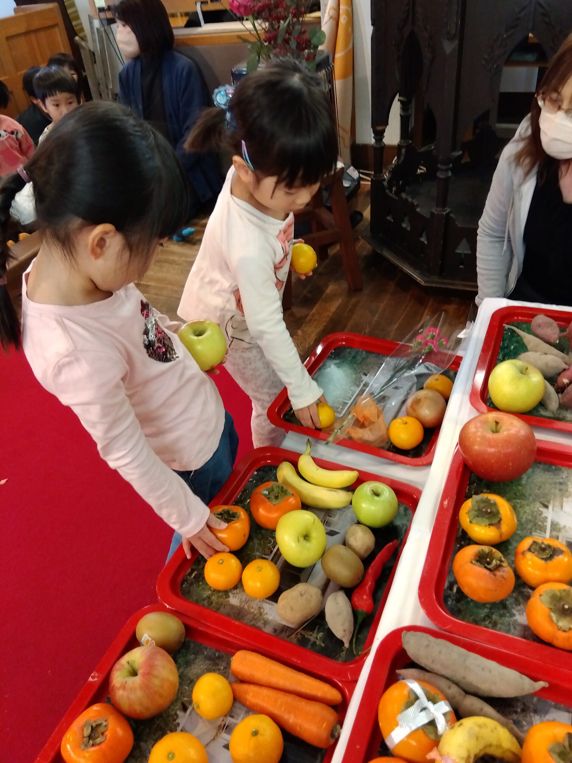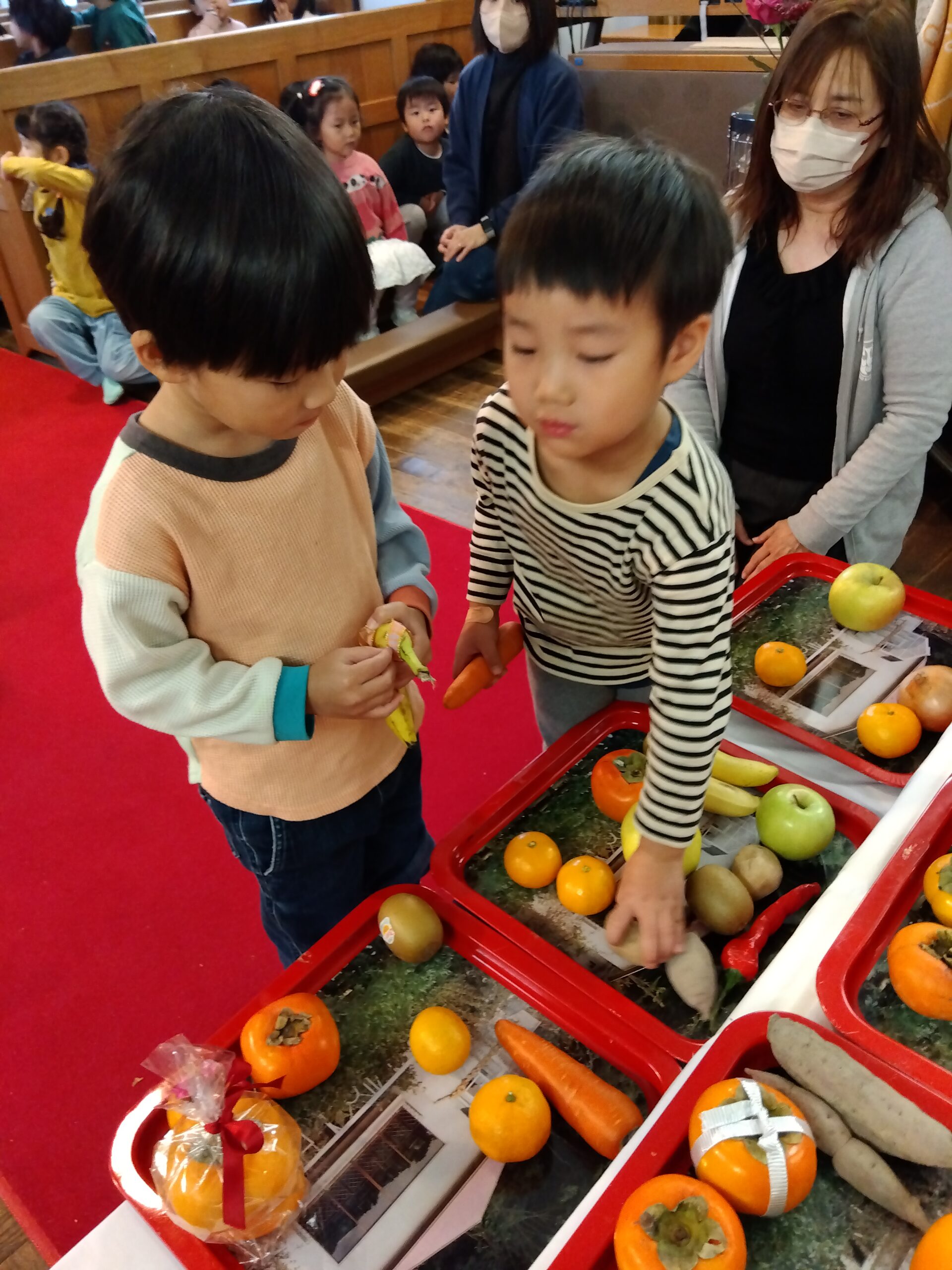 礼拝中、お話の中で吉田先生から「このたくさんの食べ物や自然、恵みは誰が作ってくれたのかな?」との問いに、「畑でお世話する人!」「太陽のひかり!」「神さま!」と先生もびっくりな回答をする子どもたちでした。