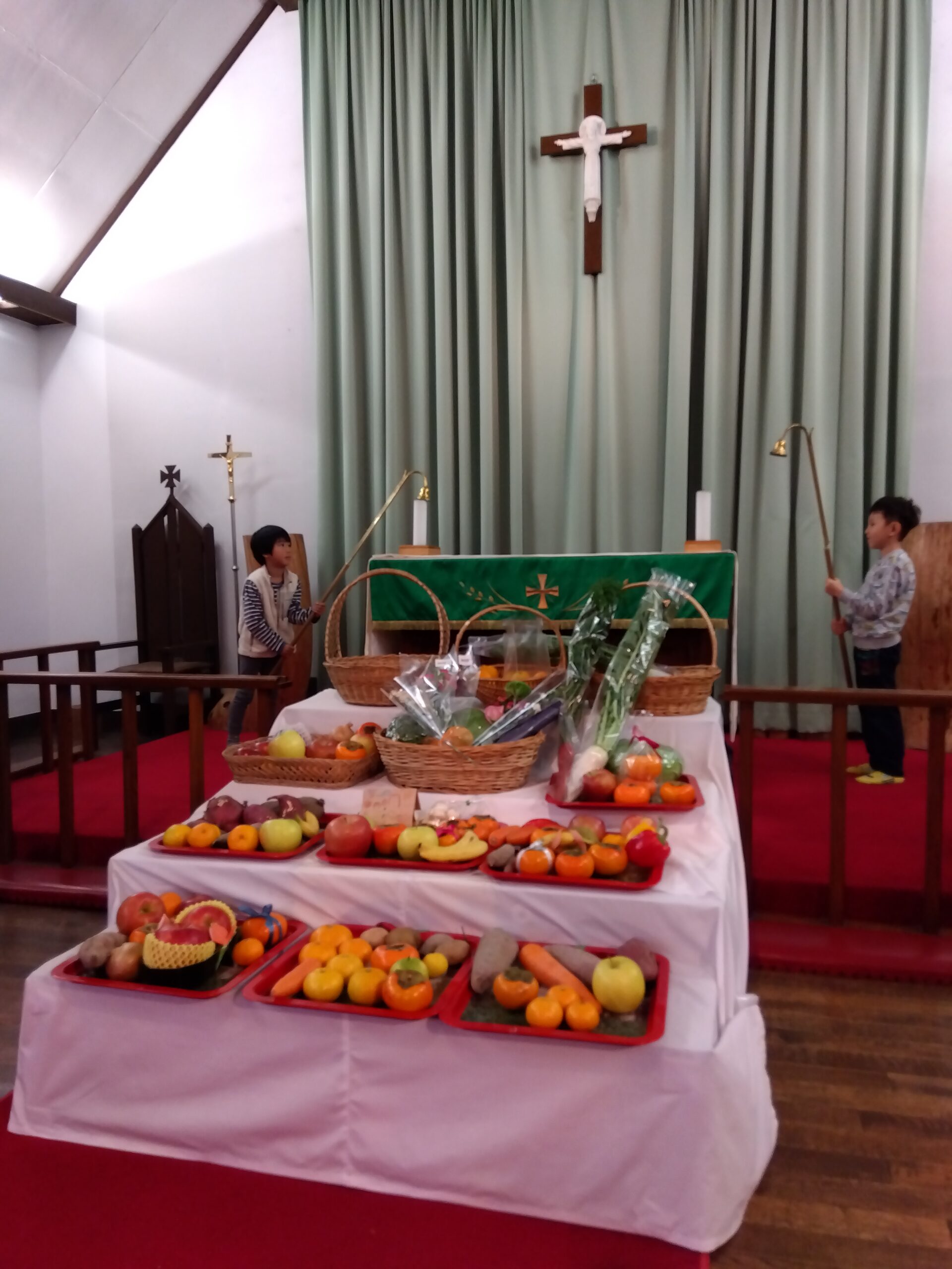 普段の礼拝とは違い、それぞれのご家庭から持ち寄って下さった果物や野菜、花などを大切に持ち、教会でおささげしました。