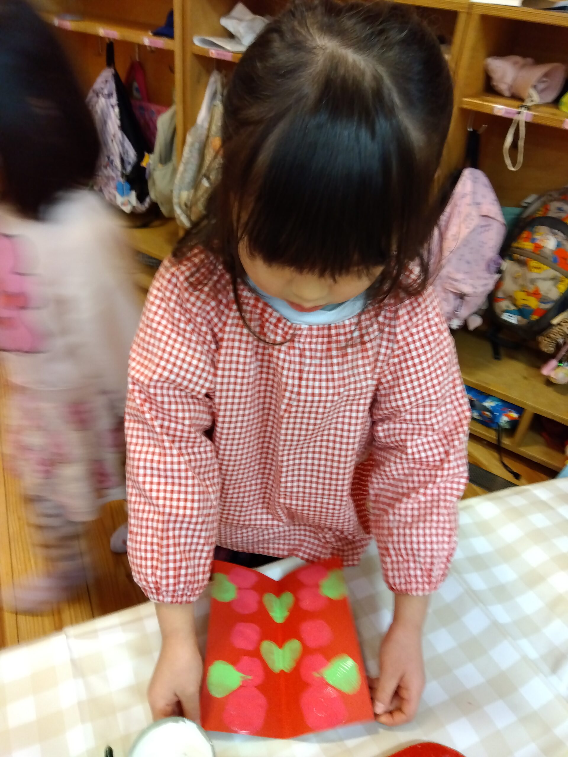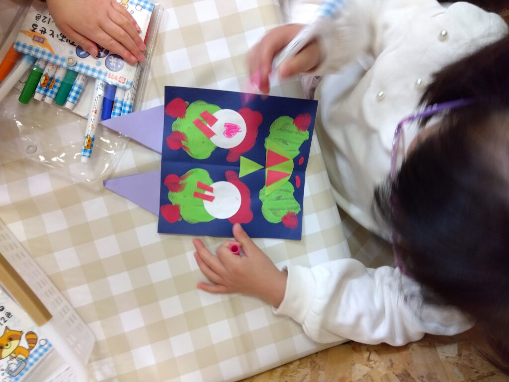 もうすぐ節分ですね。ぶどうぐみでは鬼のお面を作りました。今回は、絵の具を塗りつけた画用紙を半分に折り絵の具を転写(デカルコマニー)をして遊びました。