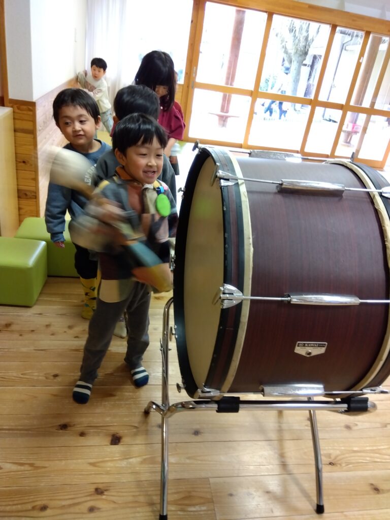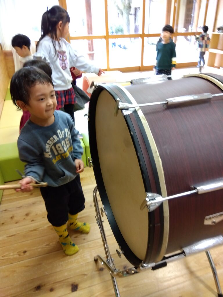 楽器は初めて使うものもあり、一度それぞれの楽器を触ってみたり、音をよく聞いてみて「こんな音か〜!」とびっくりの表情や、「やってみたい〜!」とわくわくした表情、それぞれのわくわくを見せてくれながら取り組んでいます。