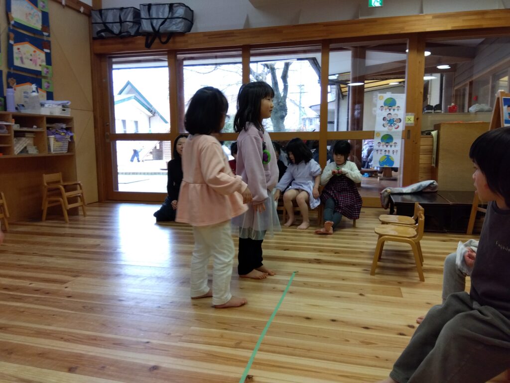 「今日は楽器する!?」「変身しようよ!(劇ごっこ)」「お家の人が来るのっていつだっけ?」と毎日生活発表会を楽しみにしている子どもたちです。