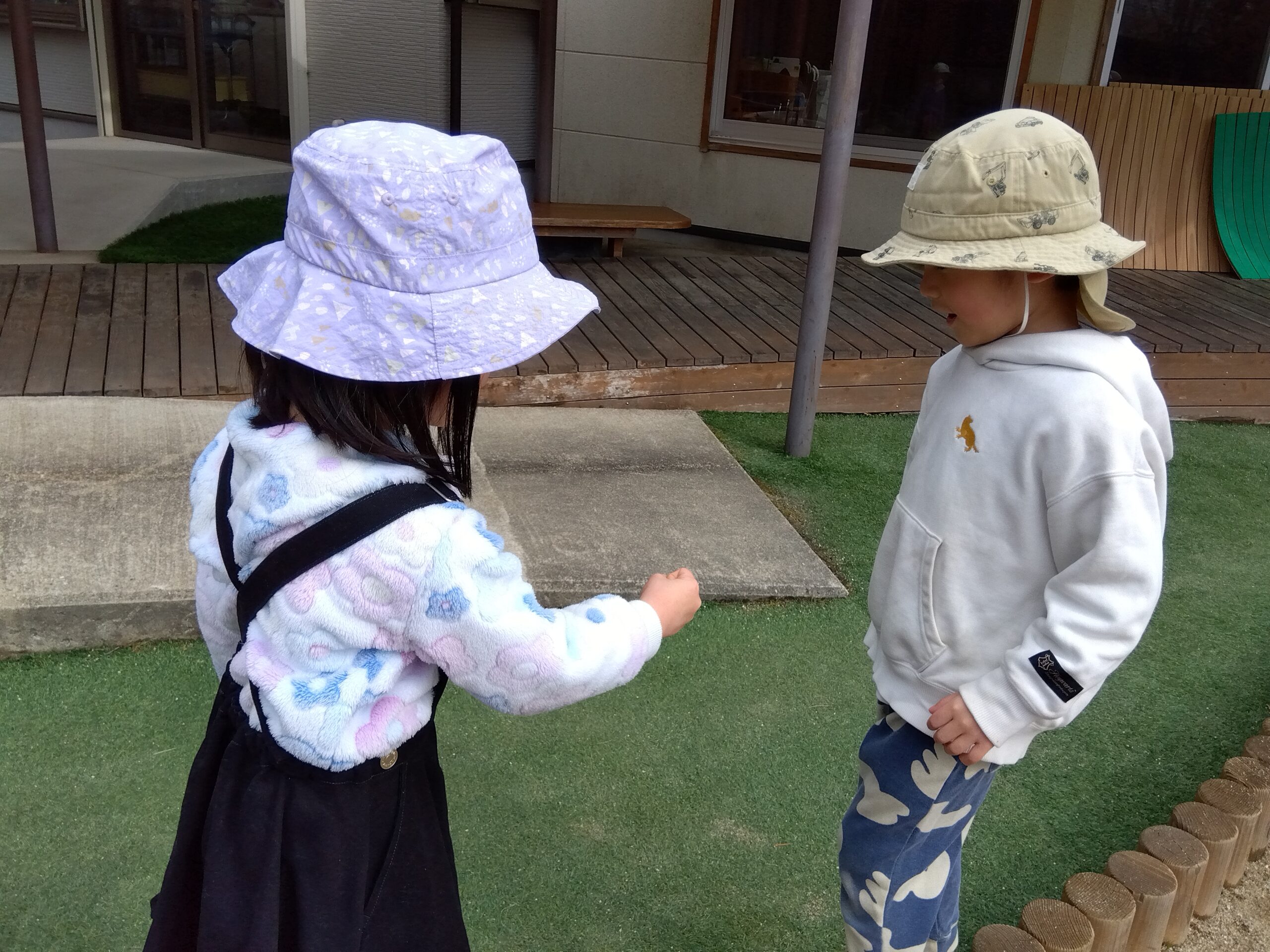 また、最近のお外遊びでは、だるまさんが転んだやどんじゃんけんほいなど、友だちを誘い合って遊ぶ姿があります。途中から入った子には「今、鬼は○○ちゃんだからね!」「こういうルールで遊んでるよ!」など友だちを気遣い声を掛けている様子が見られることもあります。