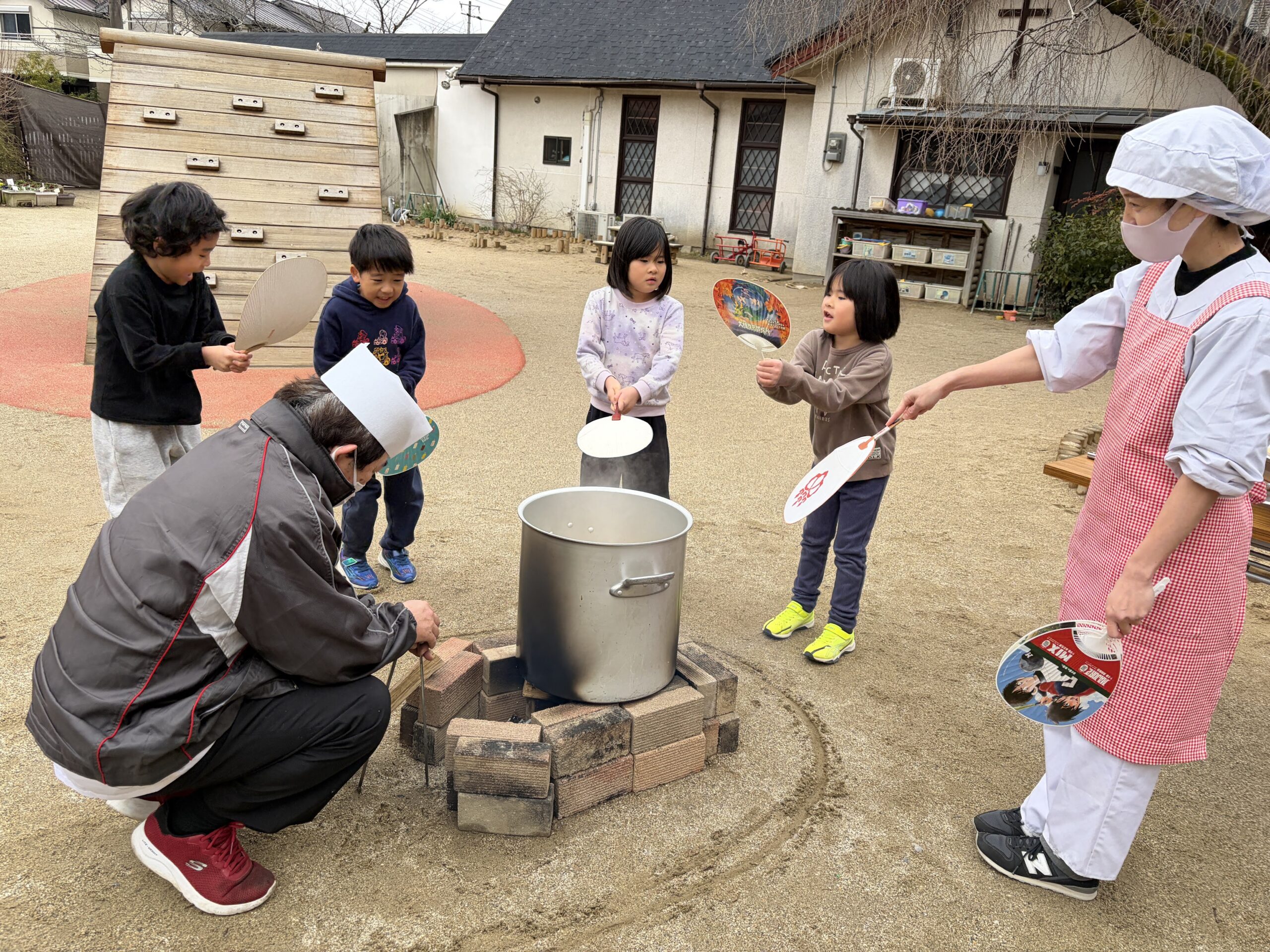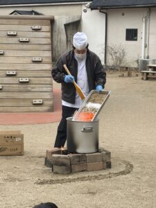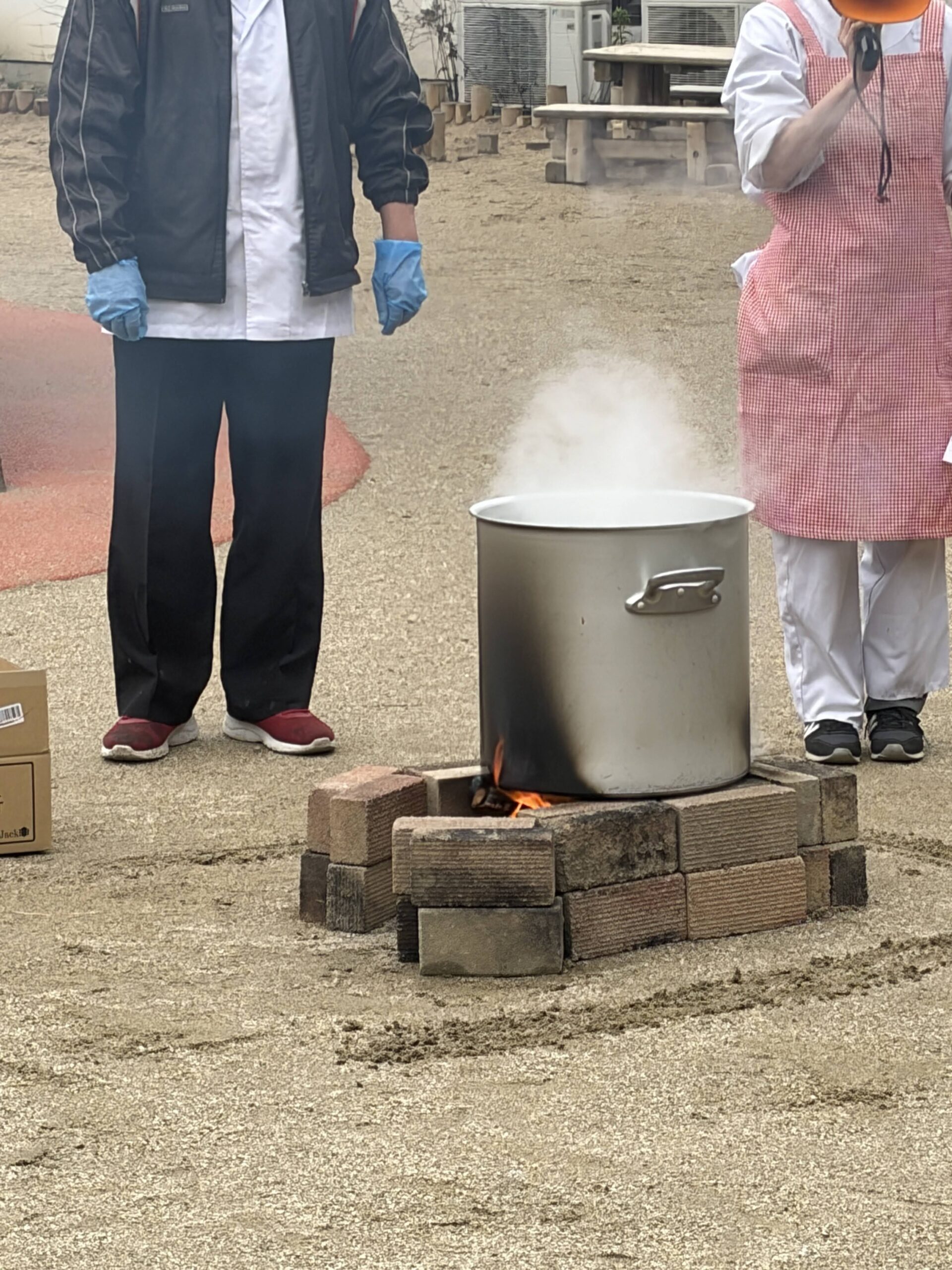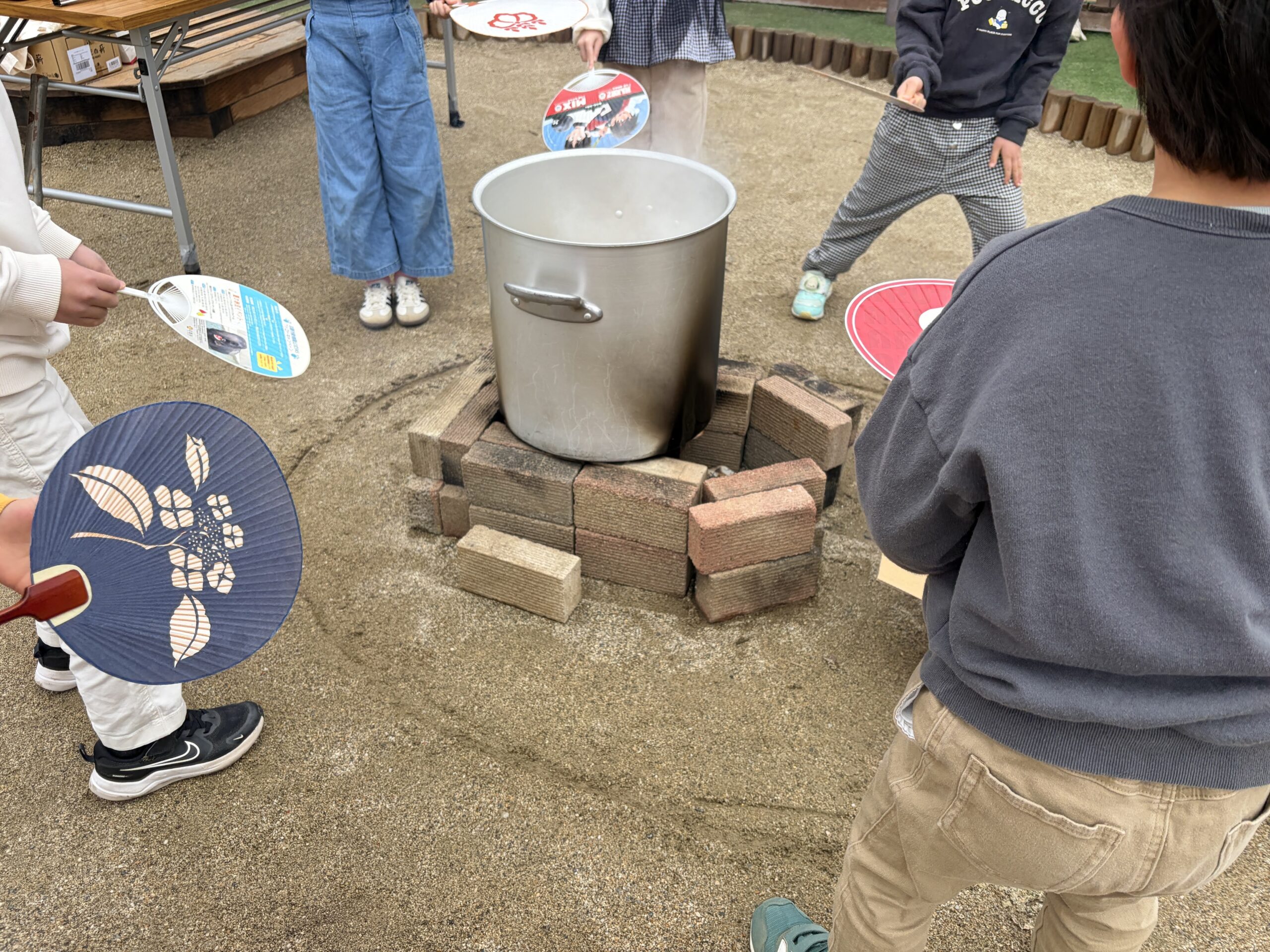 朝から、園庭に煉瓦でかまどを作り、薪を準備し火を起こしたところに大きな鍋が置かれました。