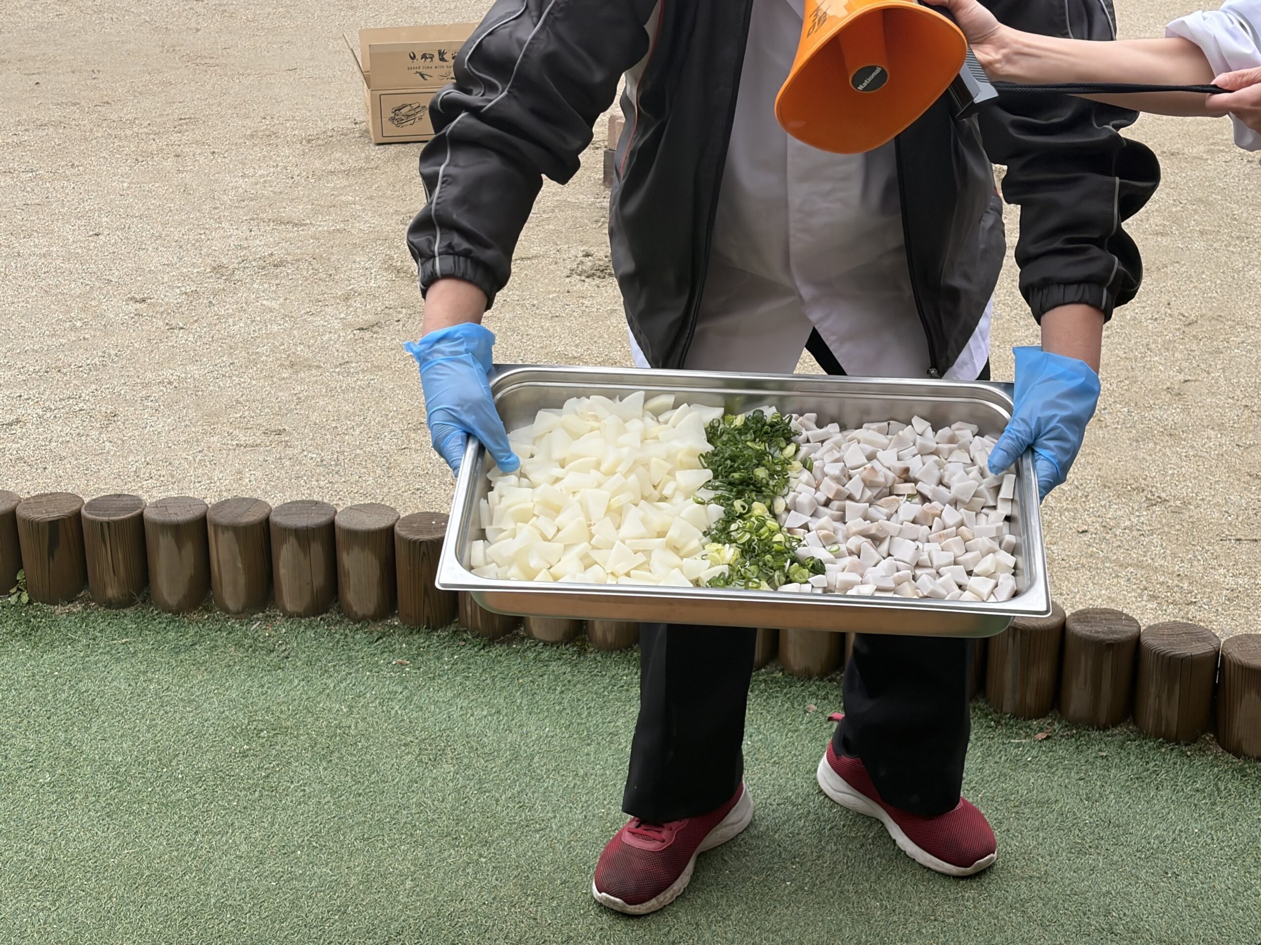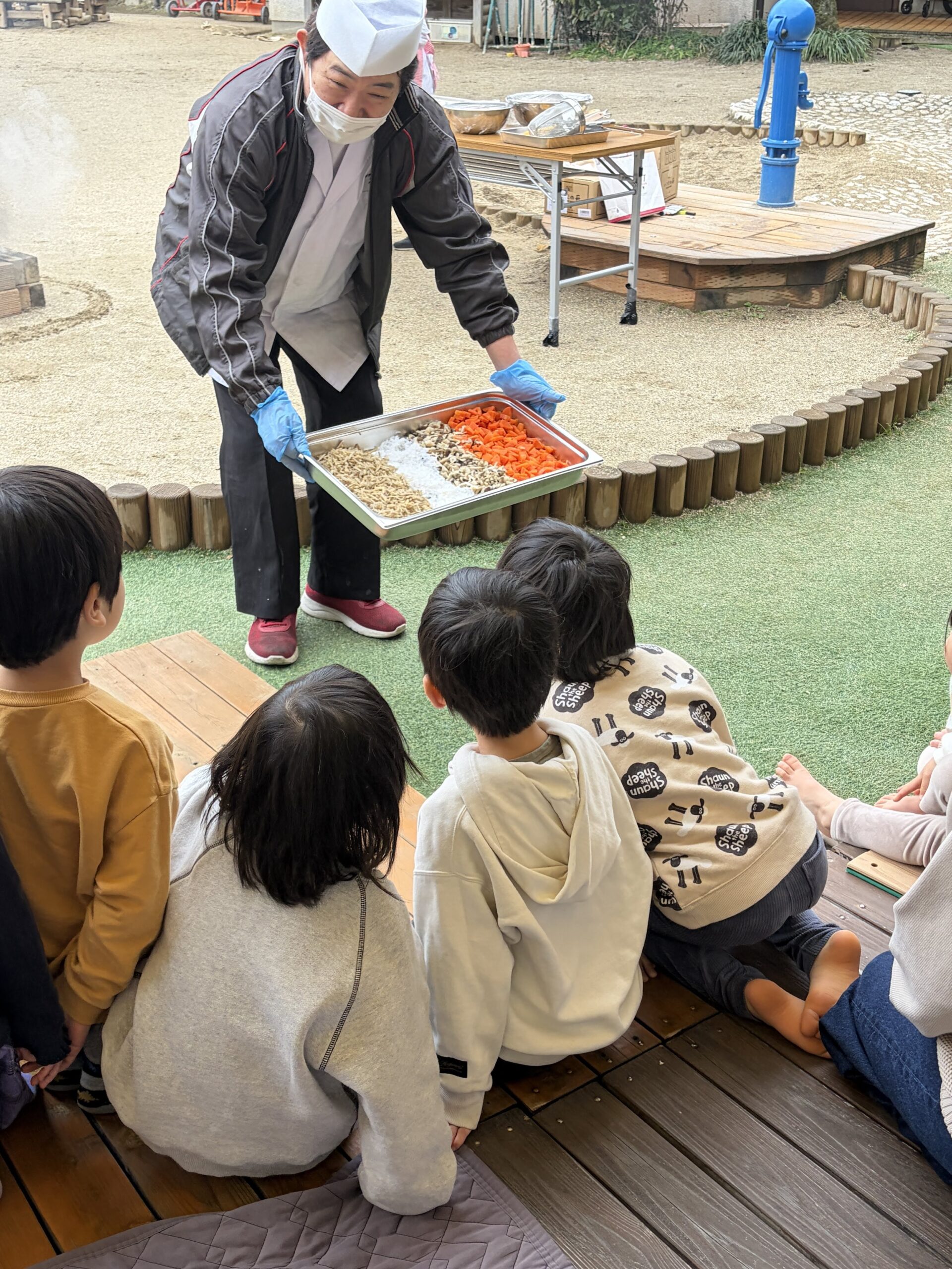 普段と違う園庭に興味津々の子どもたち、その様子を見ながら、どのように芋煮が作られるのか、具材は何だろう?と一緒に考えました。