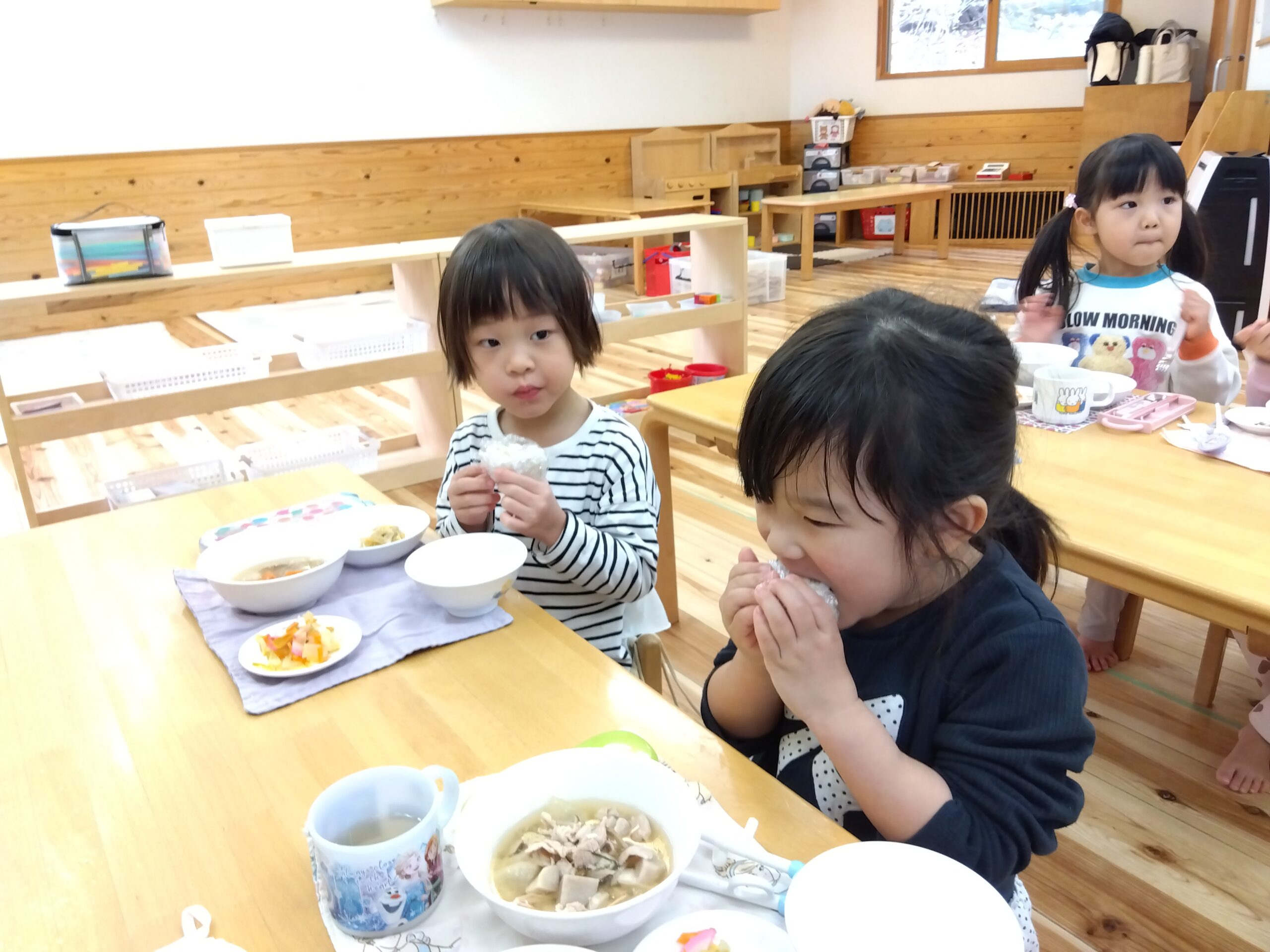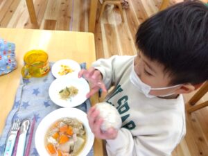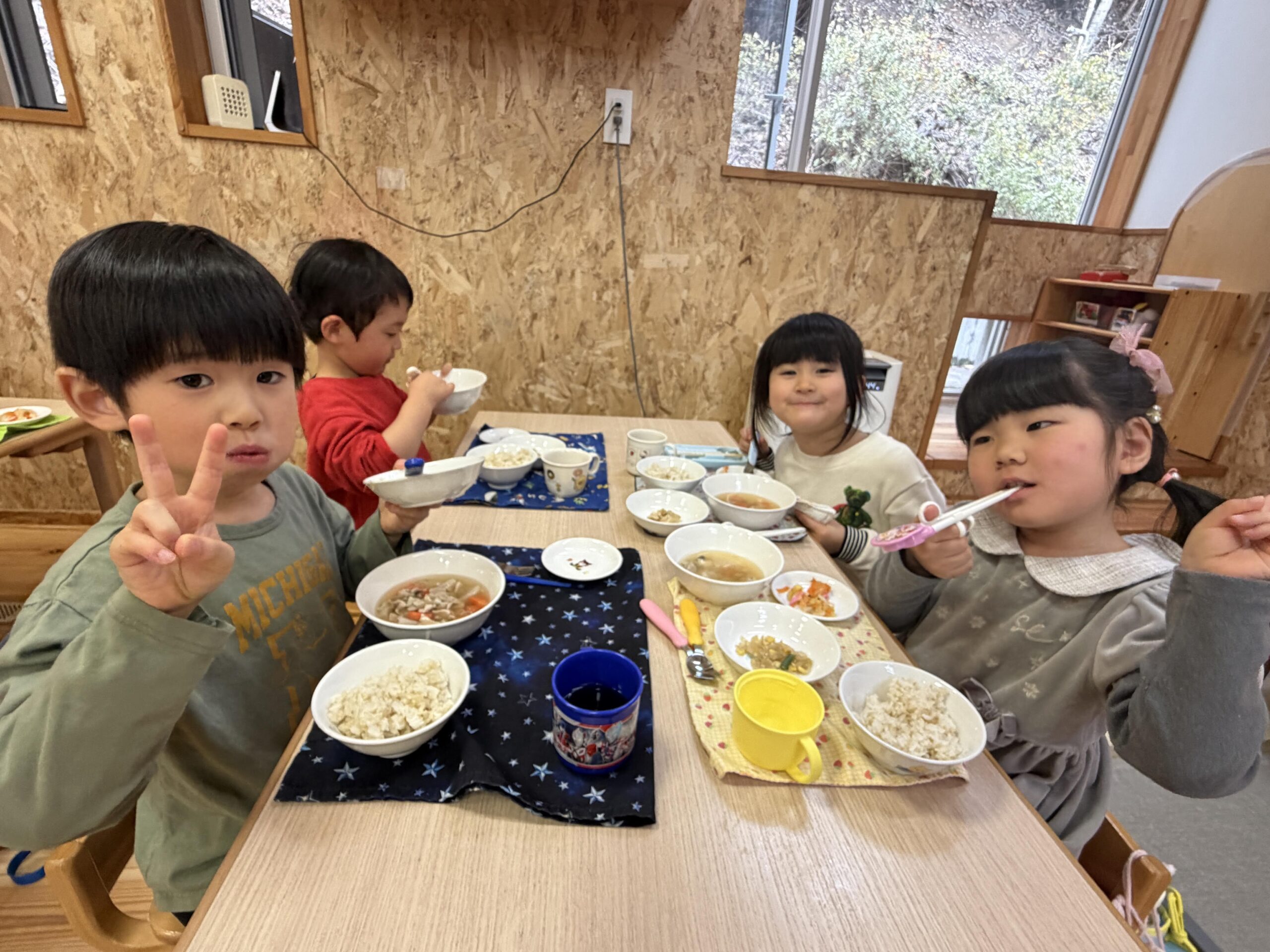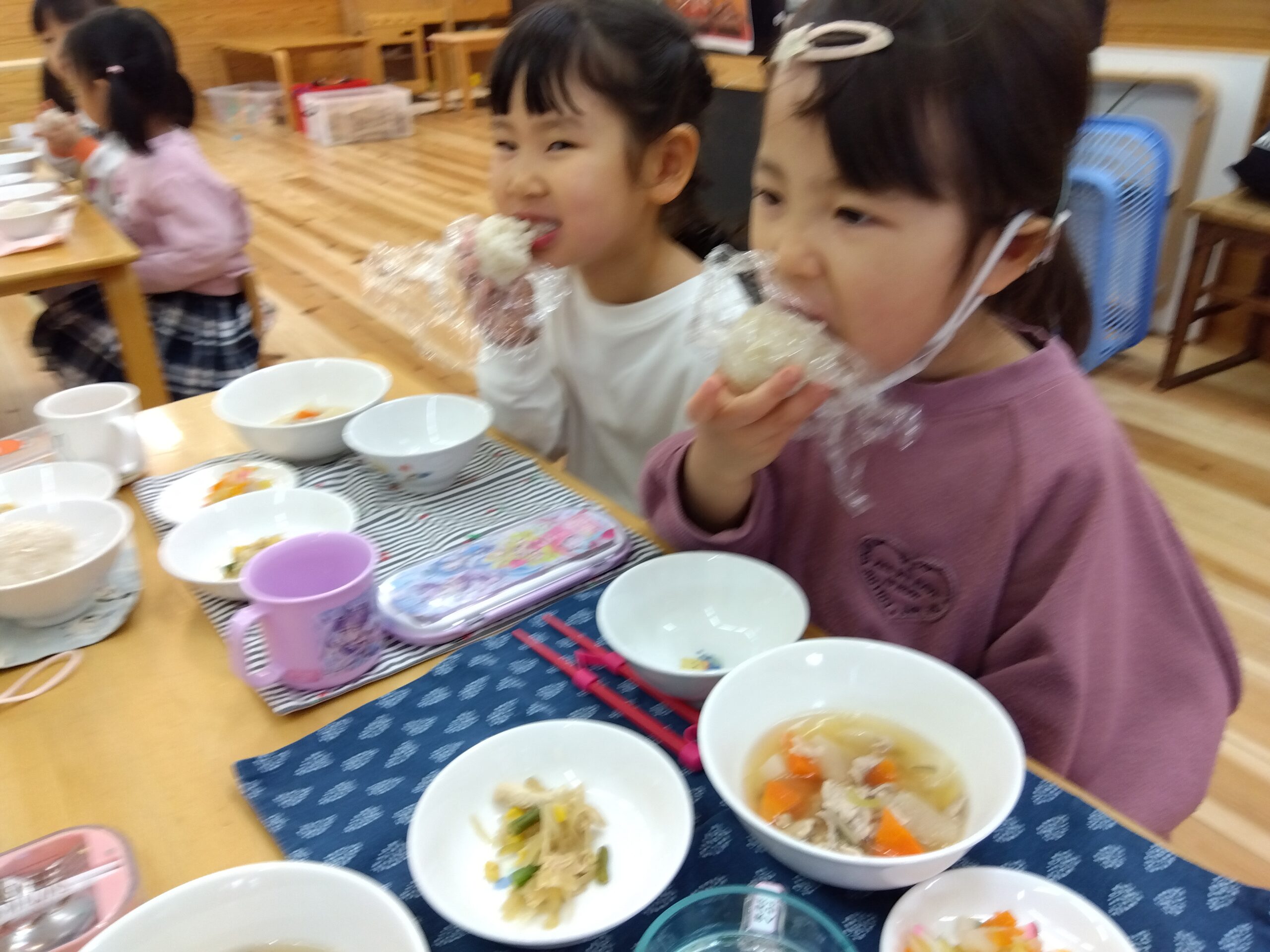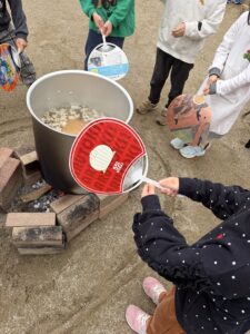 ぶどうぐみ、そらぐみ、みんなで協力して作った芋煮はとても美味しくお皿もピカピカに!