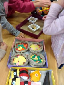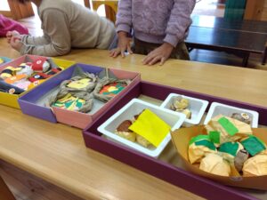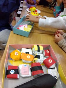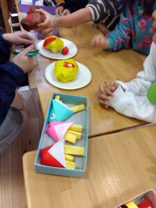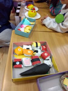 「お皿がいいな!」「棚があるよね」「箱に入れよう!」と相談をしながら、箱をハサミやセロハンテープを使い、容器を作りたくさんのお料理を、並べるととても素敵なお店に!看板も飾りお店のオープンです!