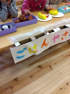 2学期に入り、連想ゲームを楽しんでいた子どもたち。「長いものはなぁに?」大根、蛇、おはし、大人のズボン等 その中でも、「お店屋さんにはなにがあるかな?」と考えてみると、たくさん連想することができました。アイス、カレー、ドーナツ、団子、たこ焼き、らーめん…