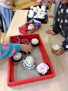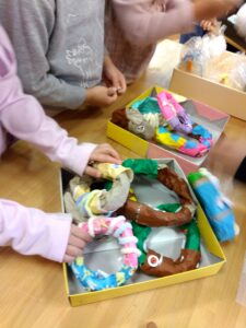 ドーナッツは抹茶味、アイスはバナナ味と好きな味になるように折り紙や毛糸沢山の素材を使いました。