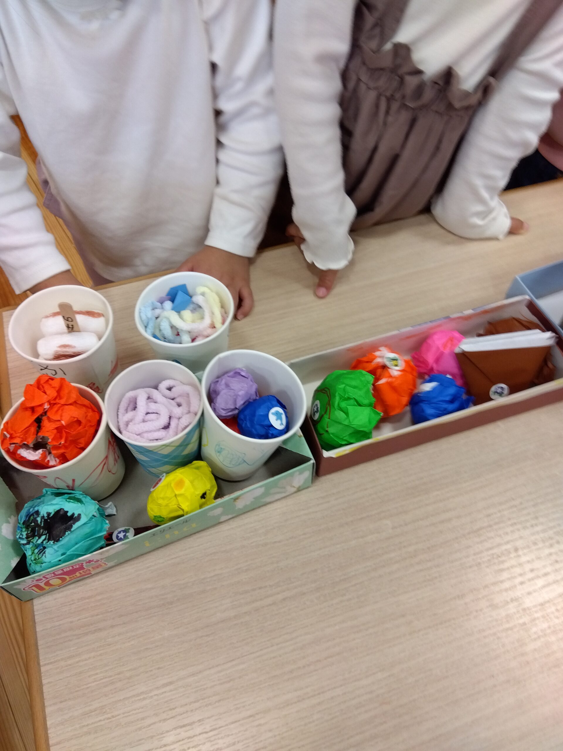 「おかしやさん」「たべものやさん」この2店舗に分かれて準備をします。今回は、1枚の紙を使って立体の作品作りに挑戦です。丸めたりねじったり、様々な方法で形を作り出します。