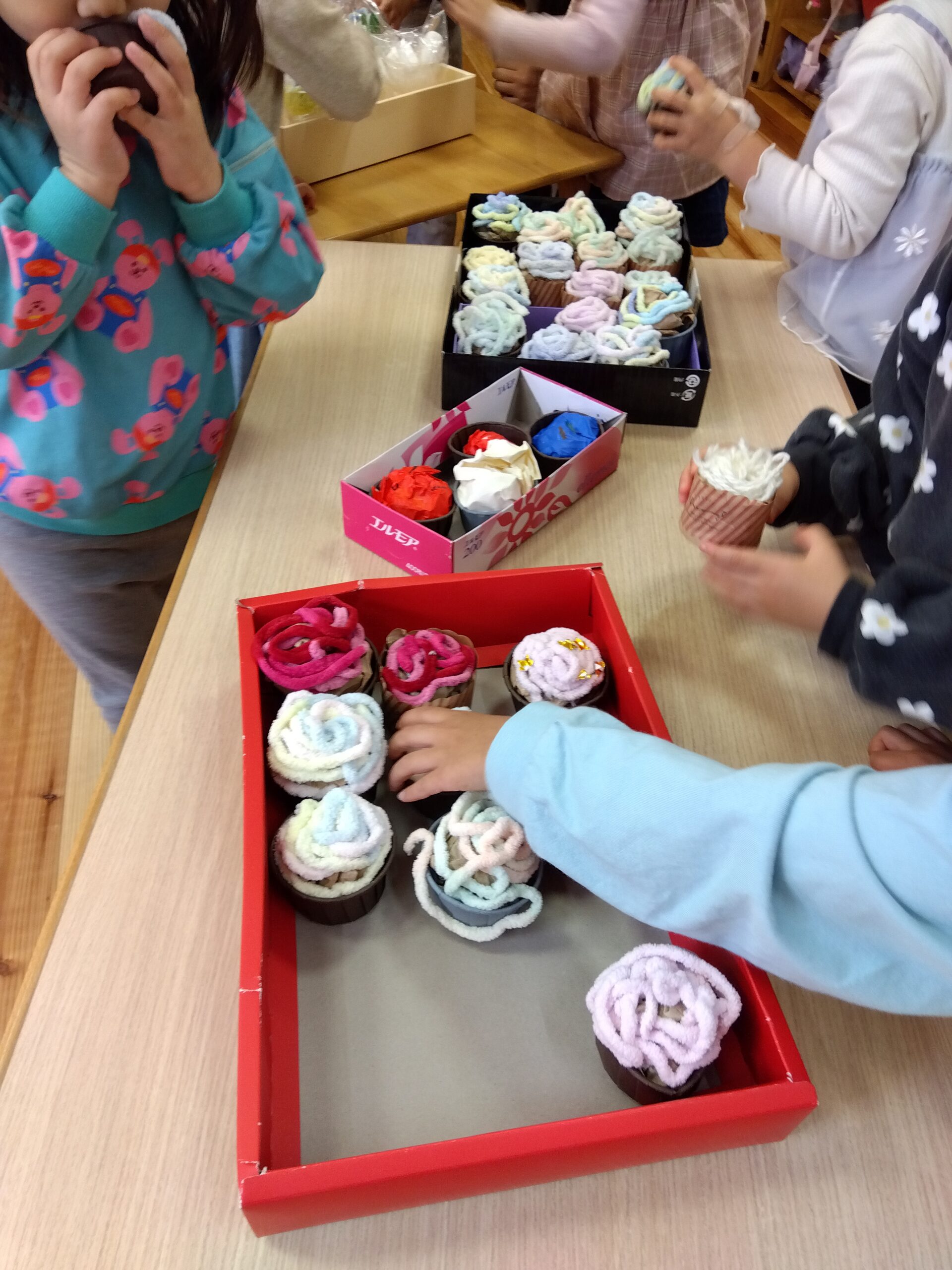 ドーナッツは抹茶味、アイスはバナナ味と好きな味になるように折り紙や毛糸沢山の素材を使いました。