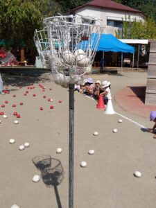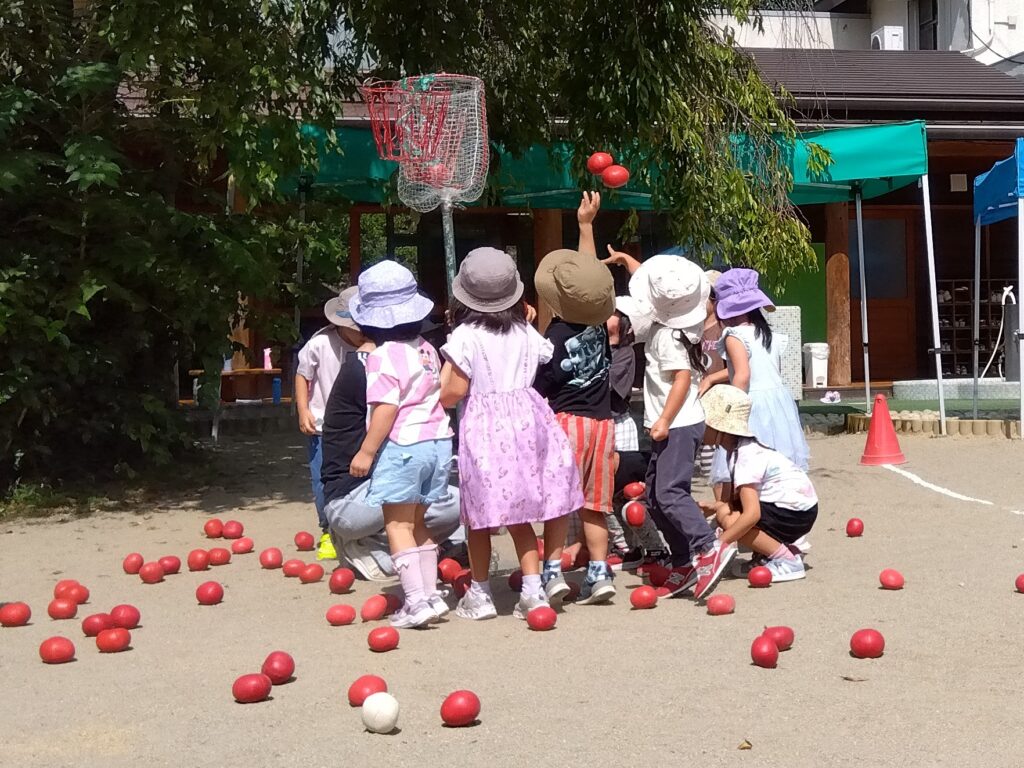たまいれは、最初はカゴにたまを入れるのが難しくて、なかなか入りませんでした。「どうしたらたくさん入るようになるのかな?」と考えてみました。投げ方は?どこから投げるといい?など実際にこれがいいかも!と思うものはやってみて考えました。子どもたちも「下からよりも上から投げた方がよく入ったよ!」と教えてくれたり、よく考えてくれました。