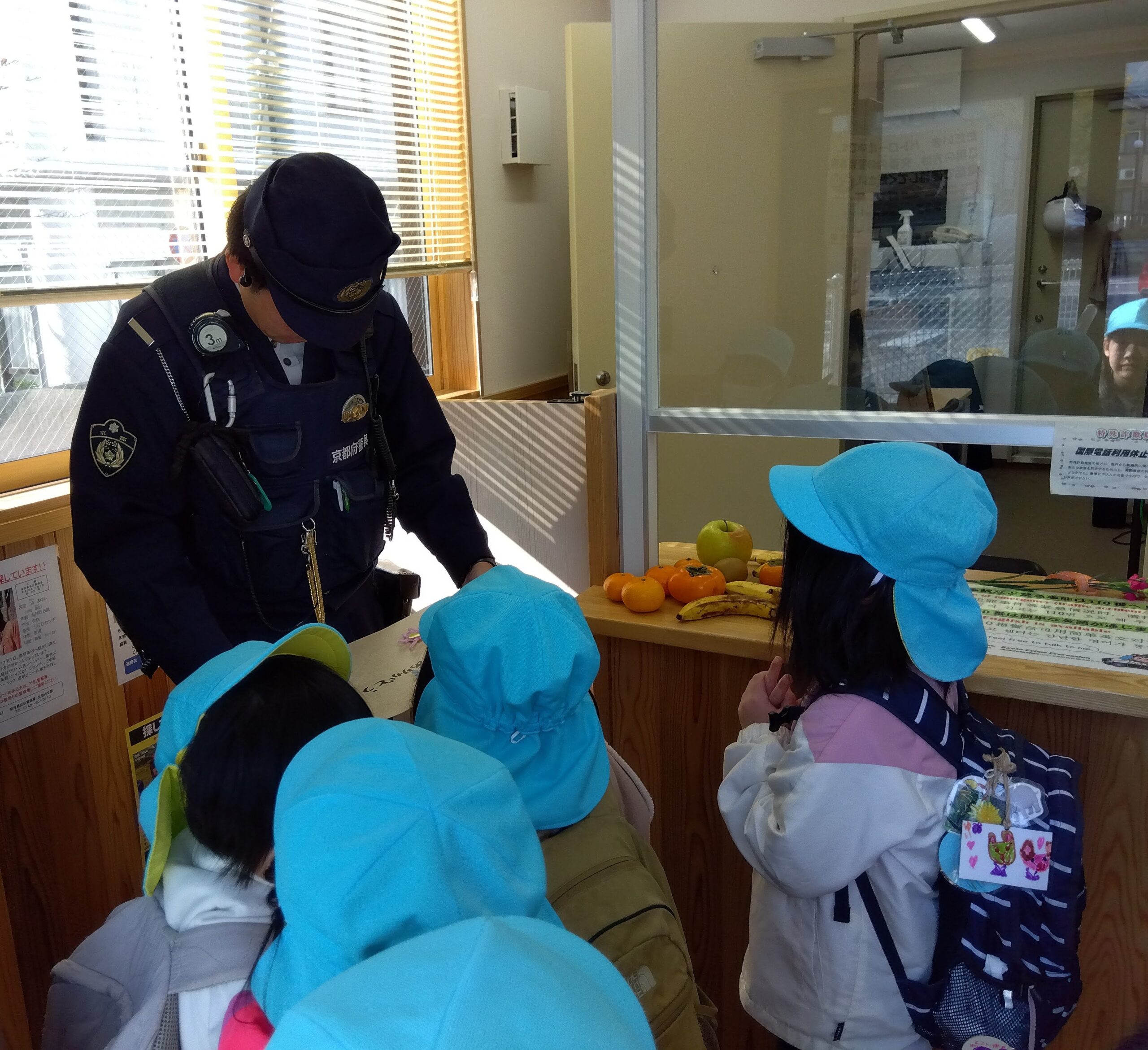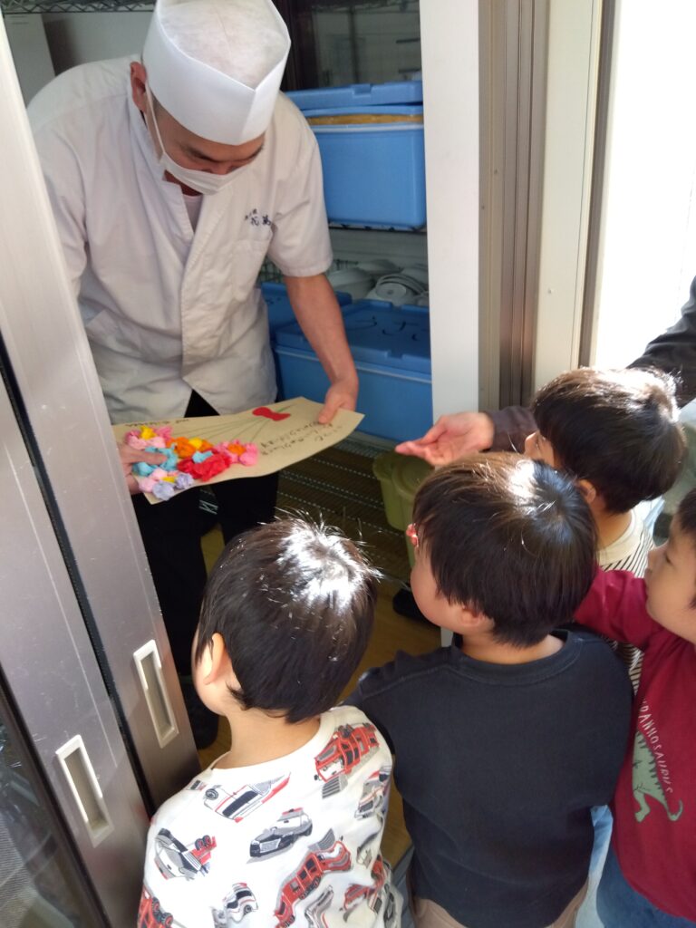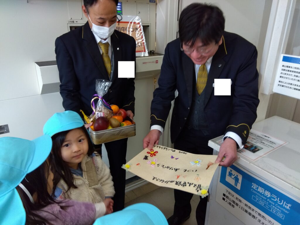そらぐみは、遠足でお世話になったりみんなが大好きな「比叡」のある叡山電車の方、いつもみんなのことを守ってくださっている警察の方、もしも火事が起きた時にいつでも助けてくださる消防署の方へお届けに。