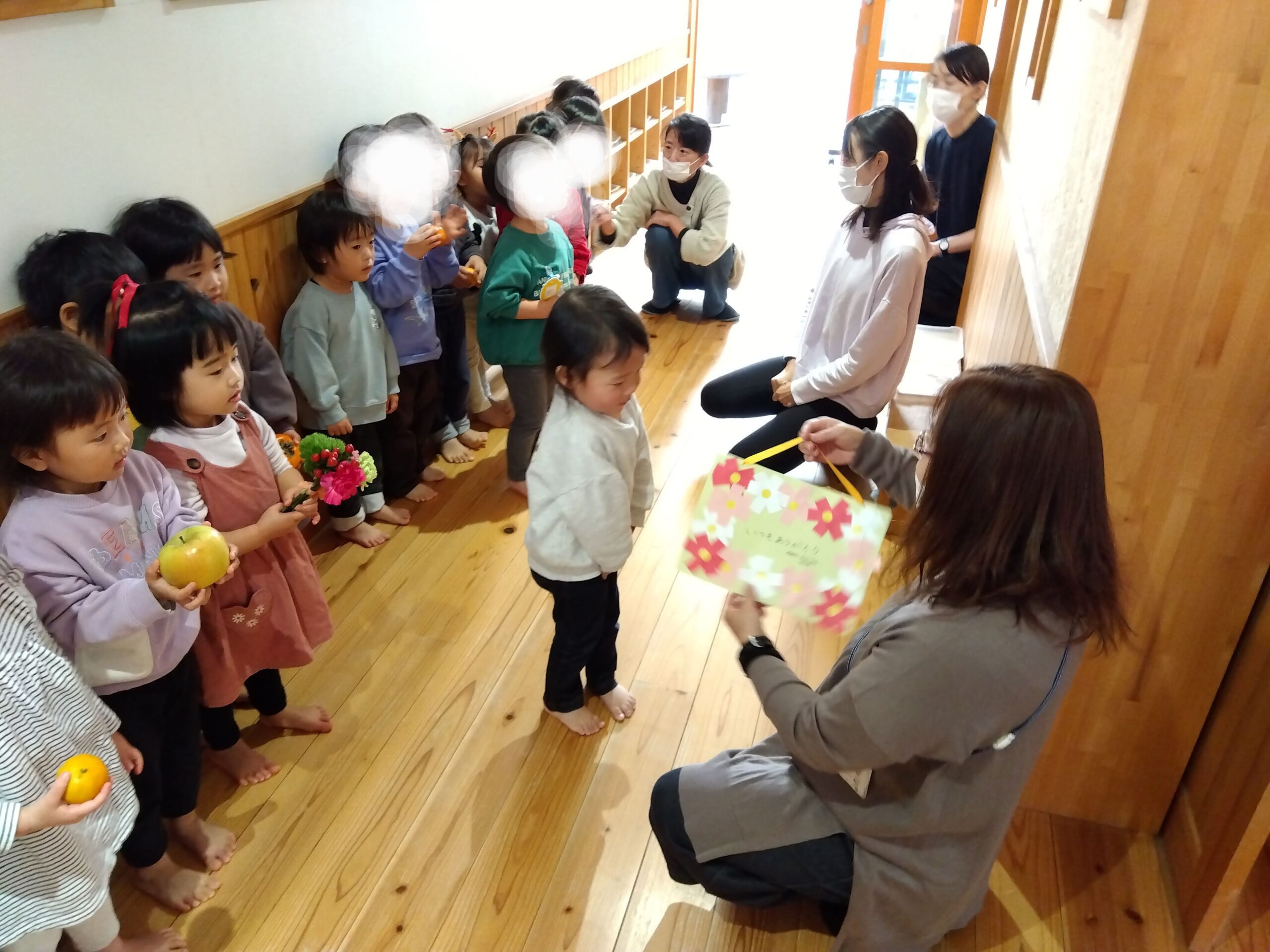 11月20日に収穫感謝礼拝がありました。みんながお捧げした果物や野菜や花などを、今日はいつもお世話になっている方々にお届けに各クラス聖光幼稚園の代表としていきました。