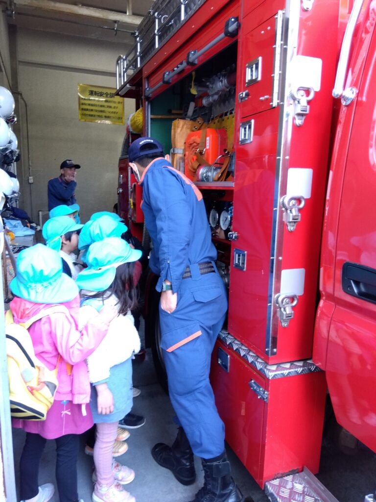 消防署では「なんで消防士になろうと思ったの?」など質問をしたり、大きな消防車を見学させていただきました。