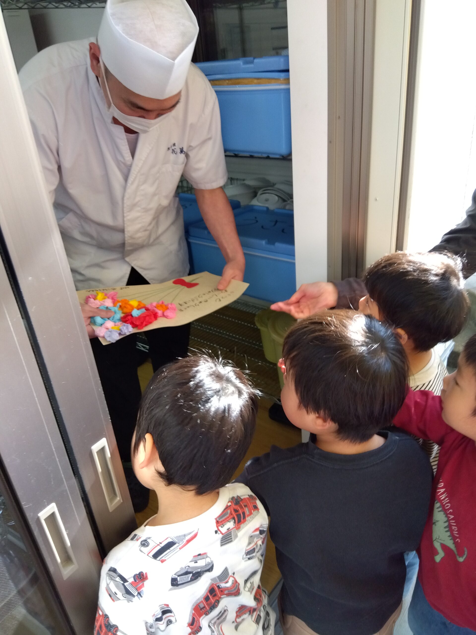 うさぎぐみは、いつも美味しい給食を作ってくれている給食室の方へ。
