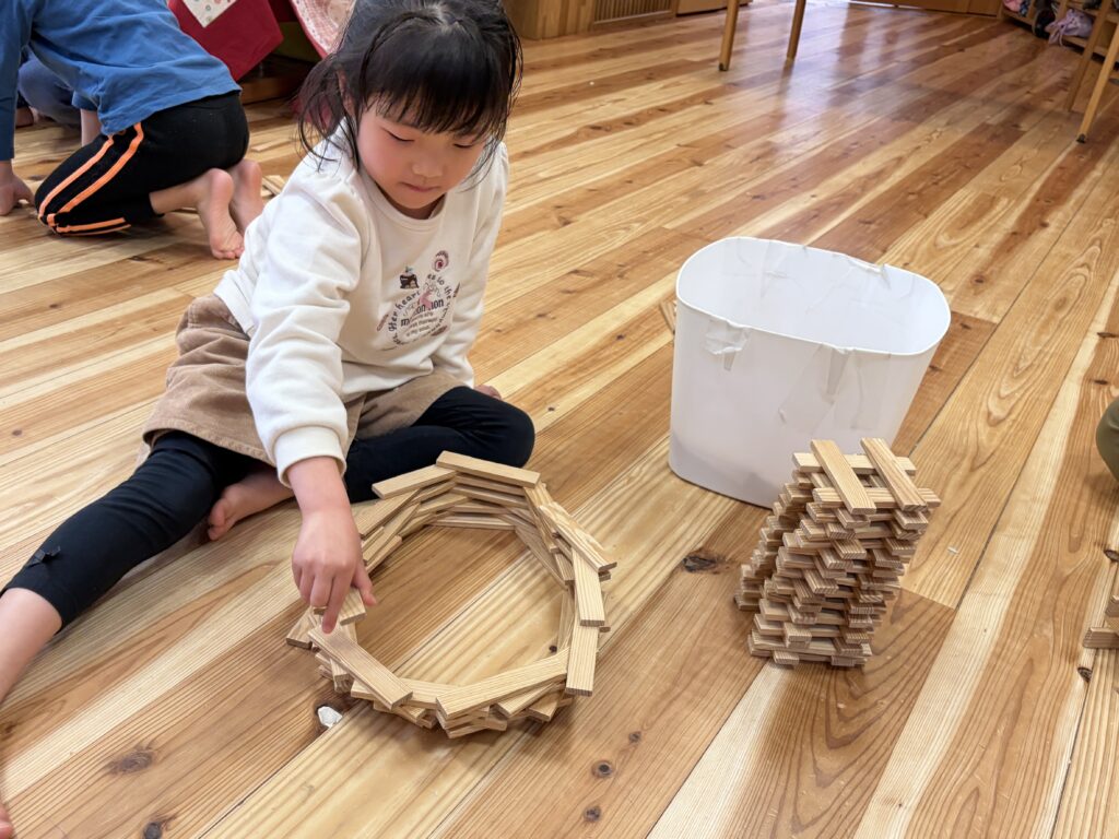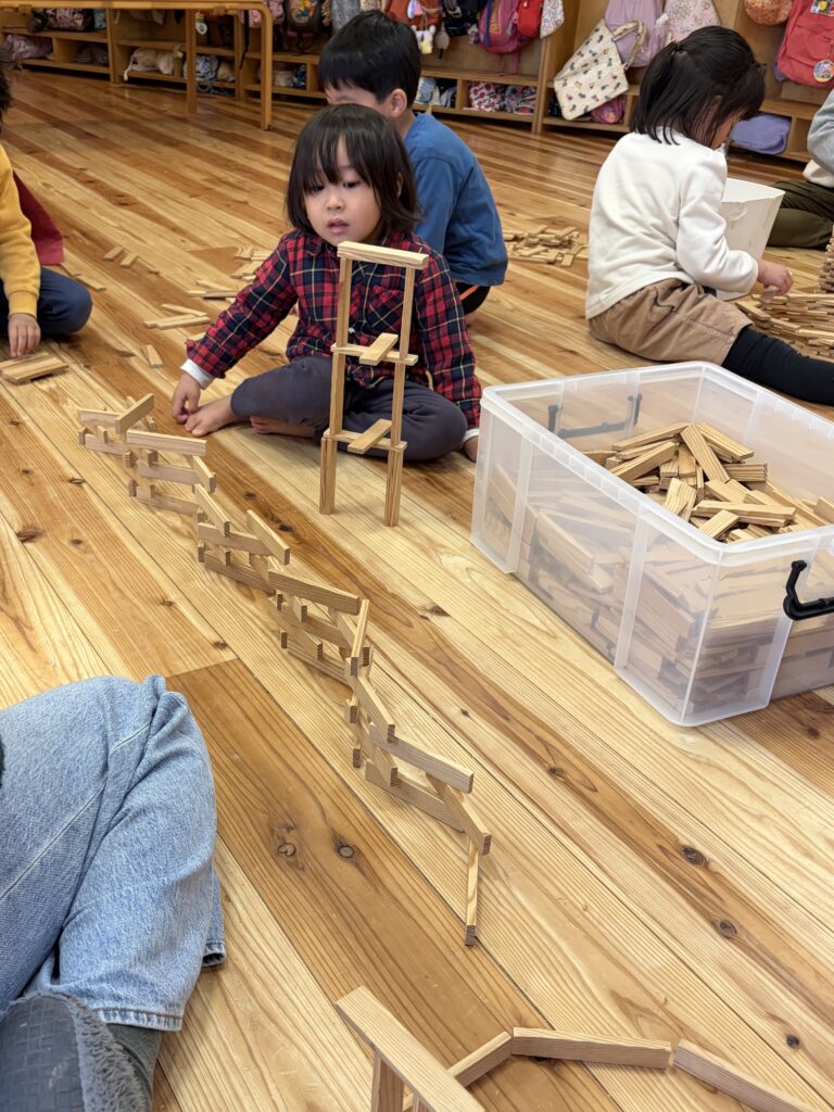 そんな姿を見ながら、うさぎ組やひよこ組の子どもたちも、「一緒にやってみる!」と置き方を教えてもらい、一緒にタワーを作ってみたり、見よう見まねで同じようなものを作ってみる姿がありました。