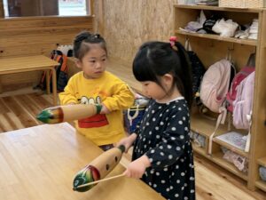 すず・カスタネット・木魚・タンバリン・ギロの5つの楽器を用意し、音楽に合わせて自由に叩く楽器遊びをしました。