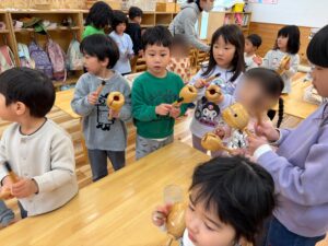 「これはどうやって持つの?」と聞いてお姉さんたちに教えてもらったり、次は何の曲かな?と耳を傾けながら、自然とリズムに合わせて叩いており、「音を楽しむ」という経験をみんなですることができました♪