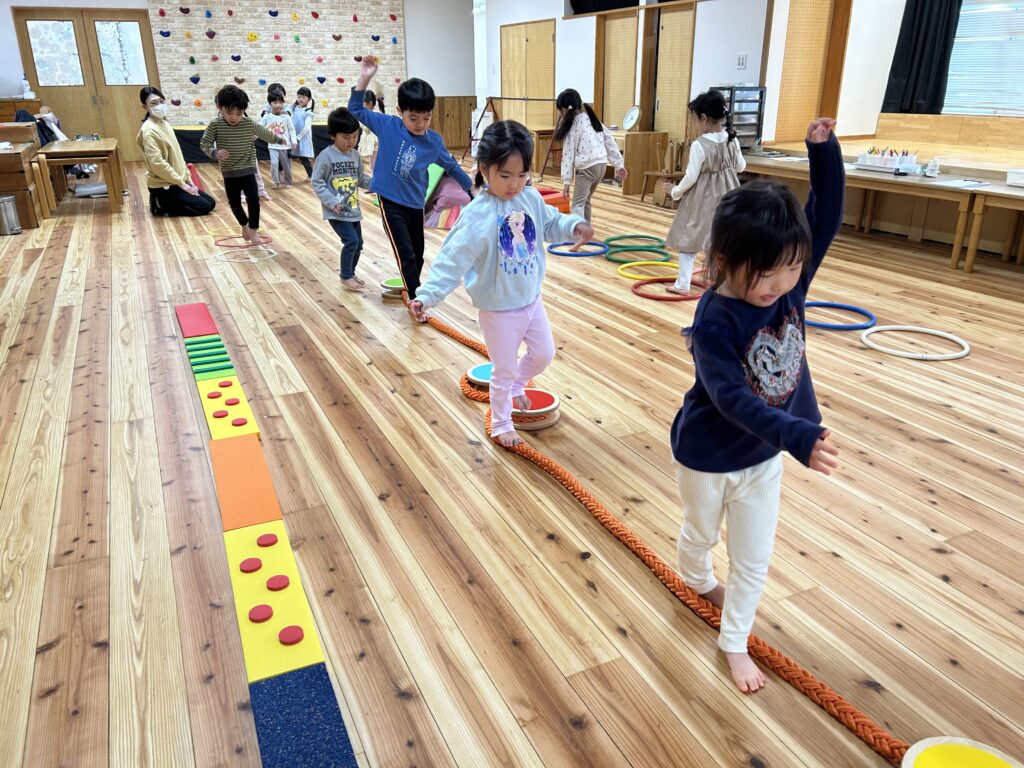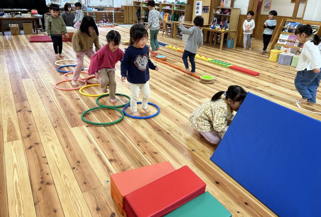 同じ形に置かれているフープでも、両足で跳ぶのか片足で跳ぶのかを試しながら、何度も何度も繰り返し楽しんでいました。