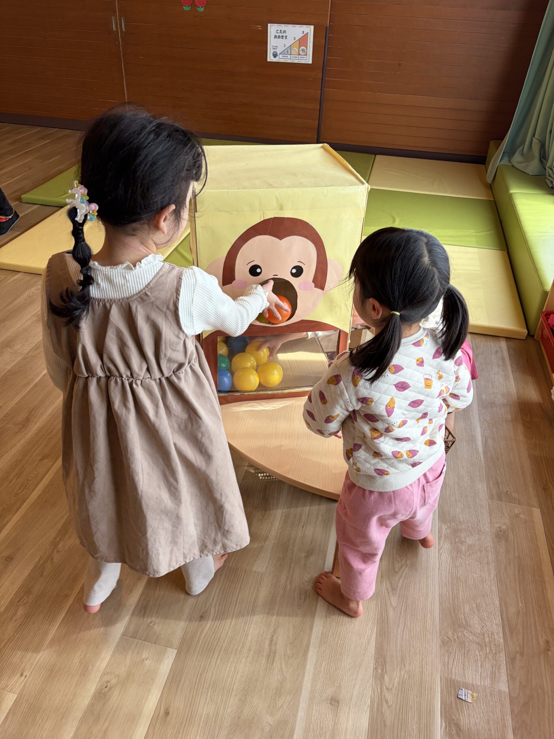 さるのボール運びと、ねこのバスケットゴールを使って、ボール遊びをしました。
