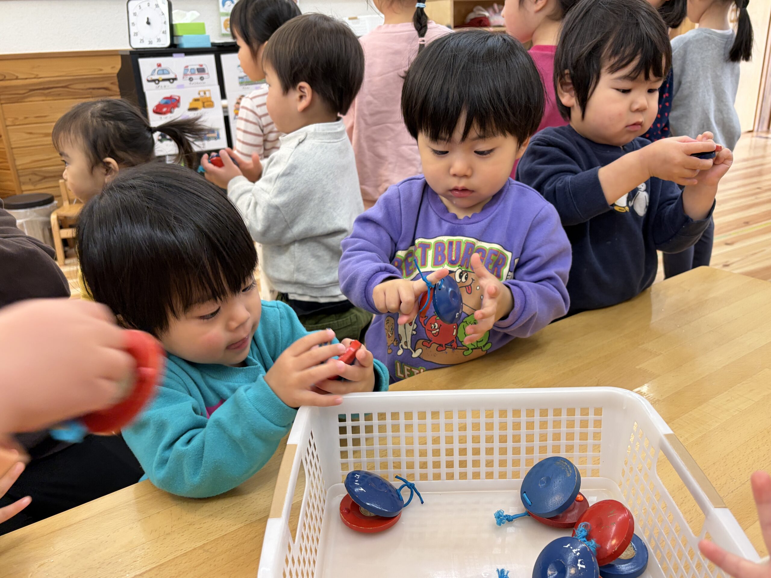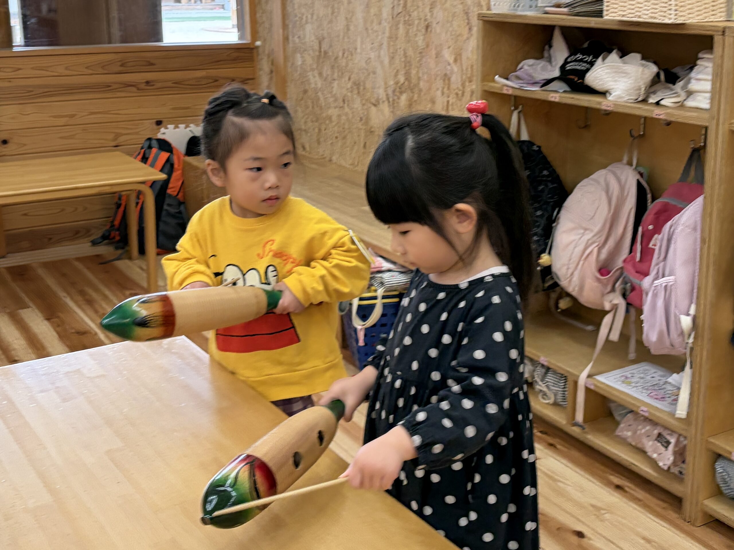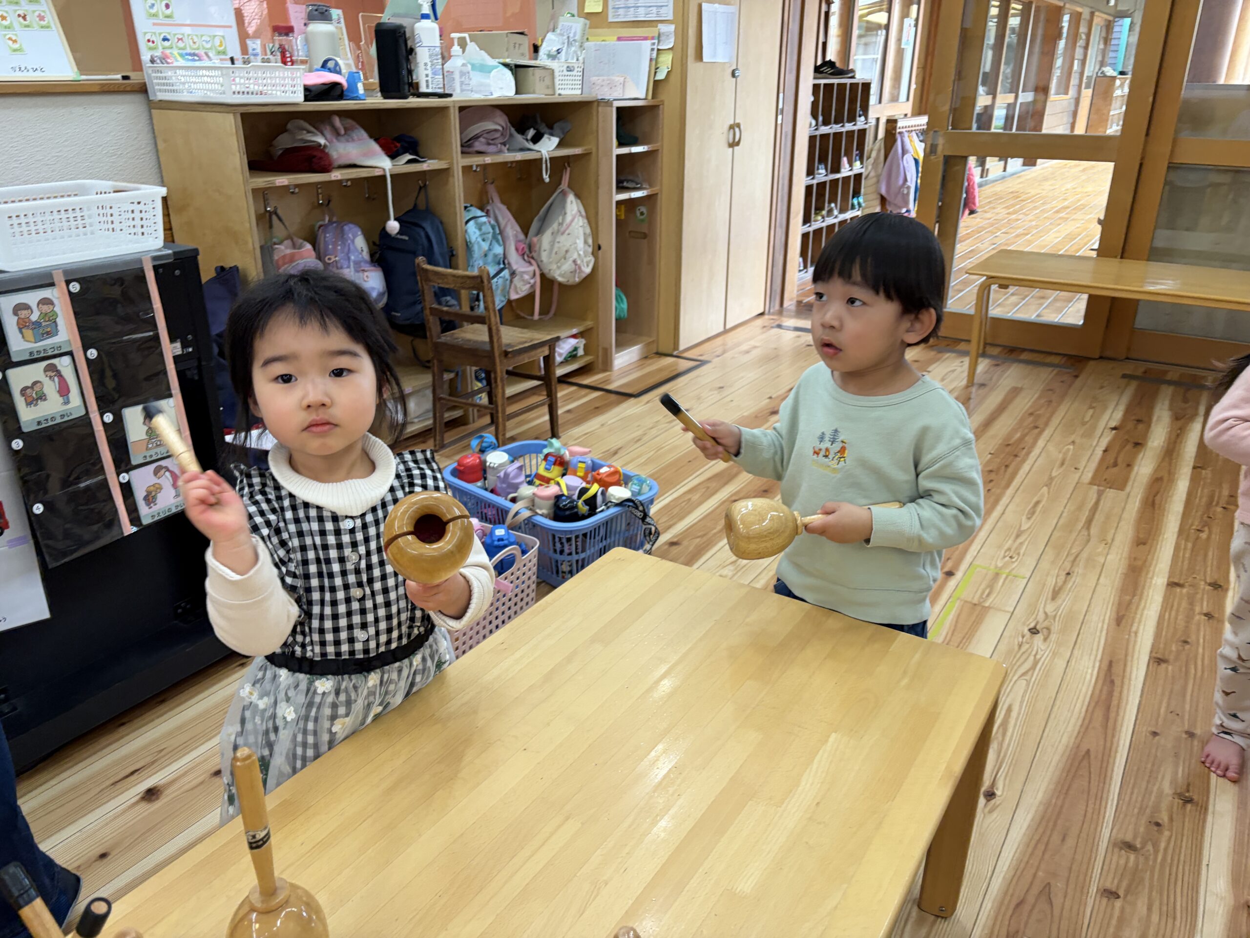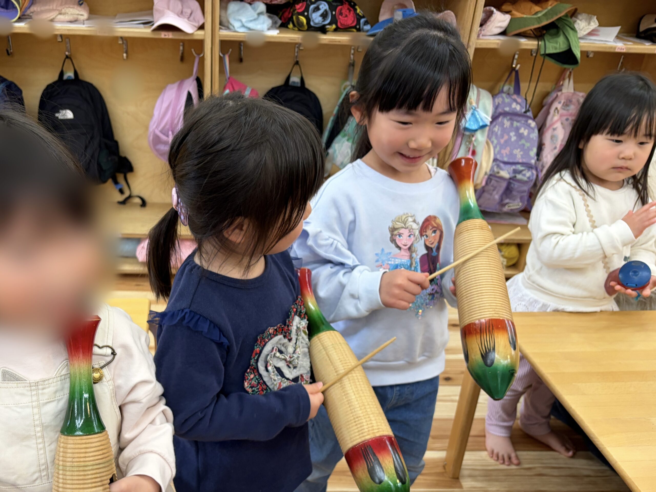 「これはどうやって持つの?」と聞いてお姉さんたちに教えてもらったり、次は何の曲かな?と耳を傾けながら、自然とリズムに合わせて叩いており、「音を楽しむ」という経験をみんなですることができました♪