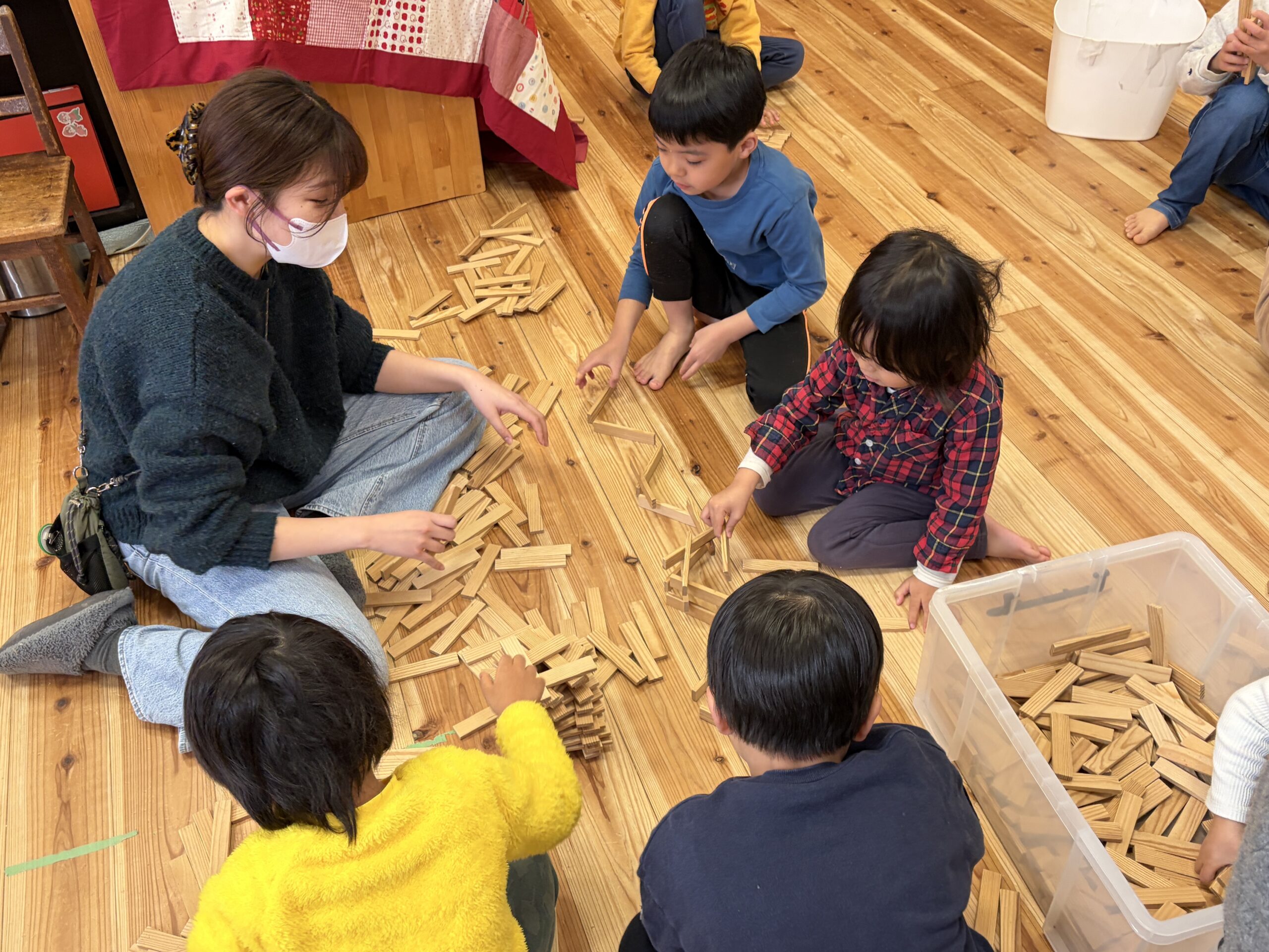 そんな姿を見ながら、うさぎ組やひよこ組の子どもたちも、「一緒にやってみる!」と置き方を教えてもらい、一緒にタワーを作ってみたり、見よう見まねで同じようなものを作ってみる姿がありました。