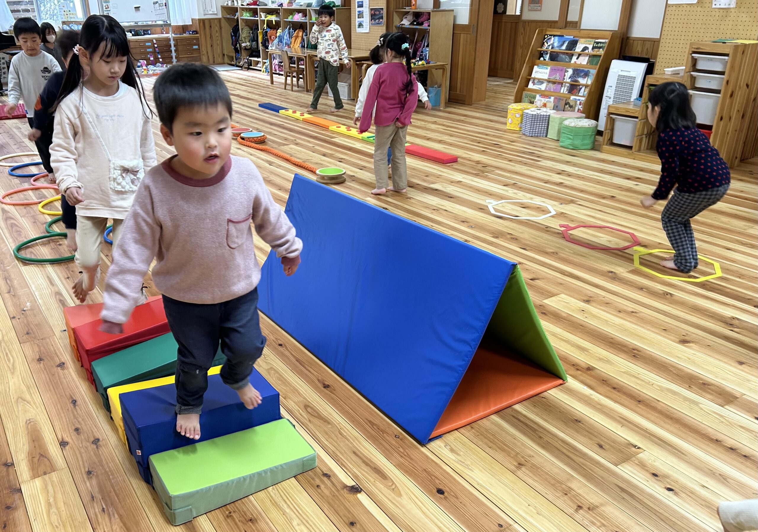 そらぐみの部屋では、フープやトンネル・跳び箱からジャンプ!など体をのびのびたくさん動かすことができるコーナーです。