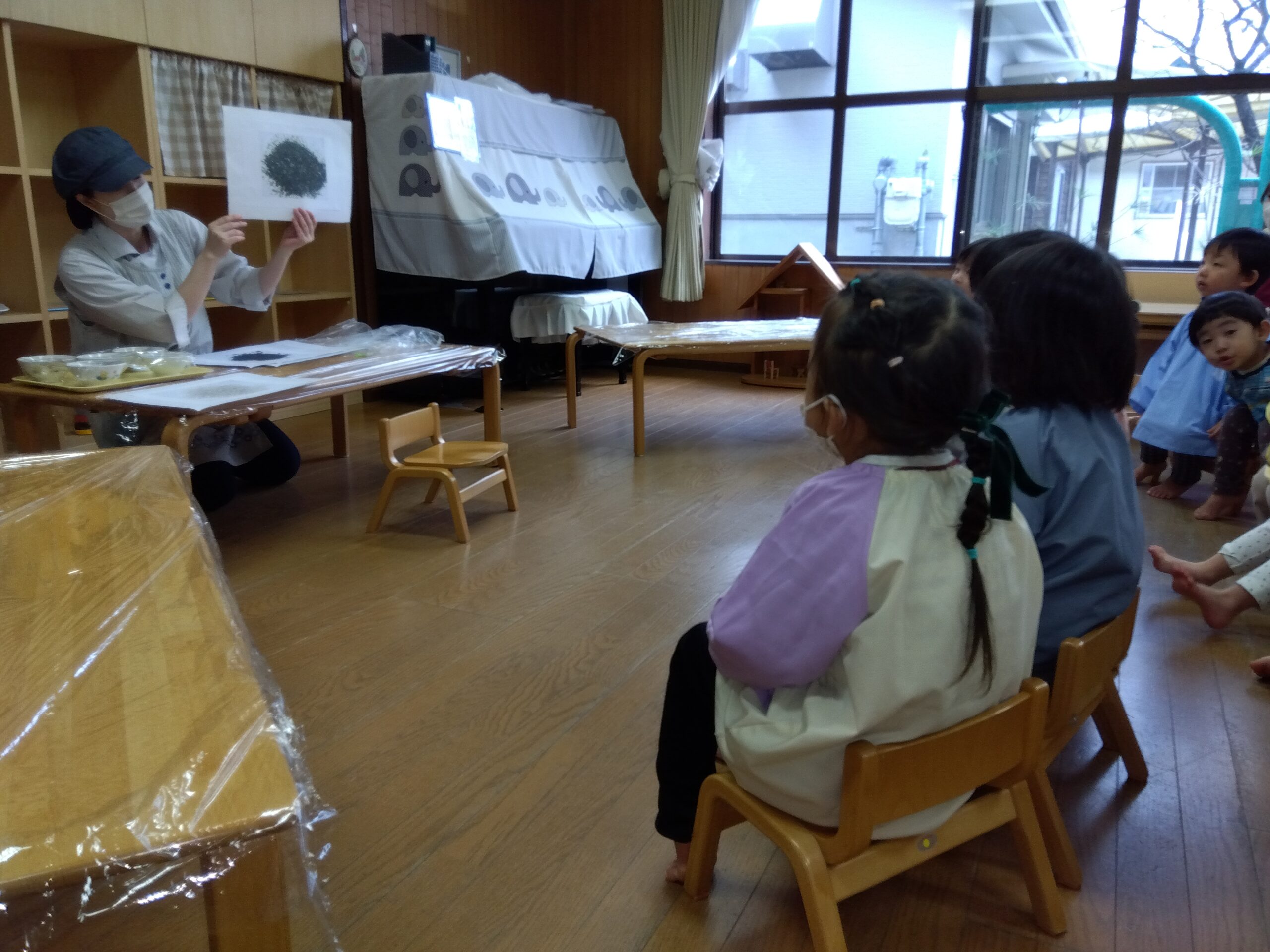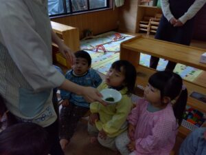 給食の大山先生と朝のあいさつをして、ふりかけの材料の話や材料の匂いを嗅いでみました。