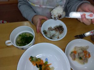 少しずつをごはんにのせたり、一度に全部のせて味わったり、気に入ってご飯をおかわりする友だちがたくさんいました。