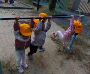 順番にすべり台に登り、うれしそうに降りてくる姿や友だちと並んで鉄棒にぶら下がり「できたよ」と喜びあう姿が見られました。