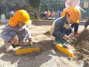 砂場では、幼稚園の砂場遊具を少し持っていったので、穴を掘ったり電車を走らせたりしてより楽そうでした。