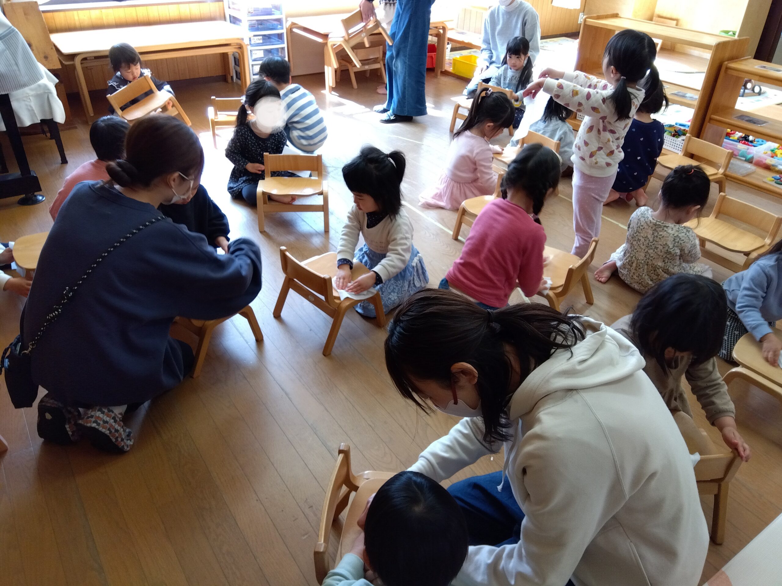 今日は、たくさん使ったひよこぐみの椅子やロッカーを「ありがとう」の気持ちを込めて拭き掃除をしました。
