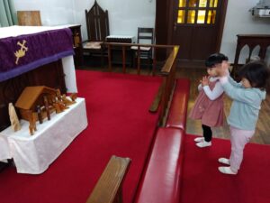 毎日のお祈りやお話、絵本を読んだり制作をしたりしながら、少しずつクリスマスはイエスさまのお誕生の日ということを感じ始めている子どもたちです。大きな星を目印に、たくさんの動物や人々にお祝いされ、うれしい日であることを一緒に喜んでいきたいと思います。