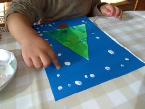 クリスマスの制作を楽しんでいます。今日は指で雪を降らしてみました。「(雪が)いっぱいになったよ」と、たくさん雪を降らせて楽しんでいました。