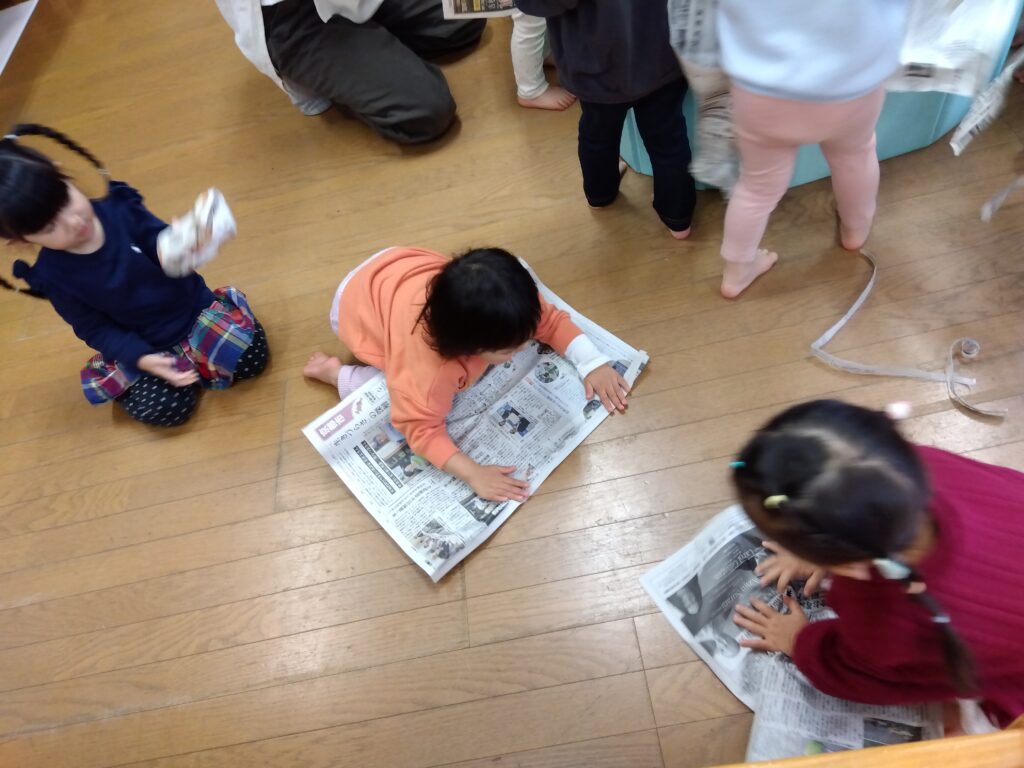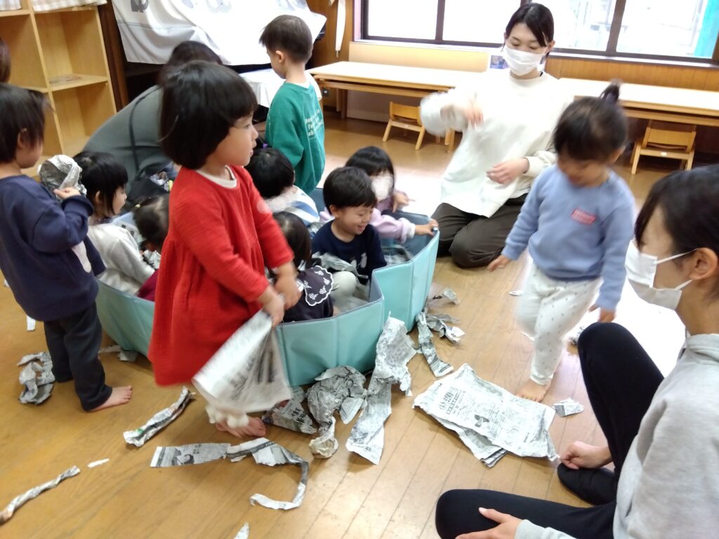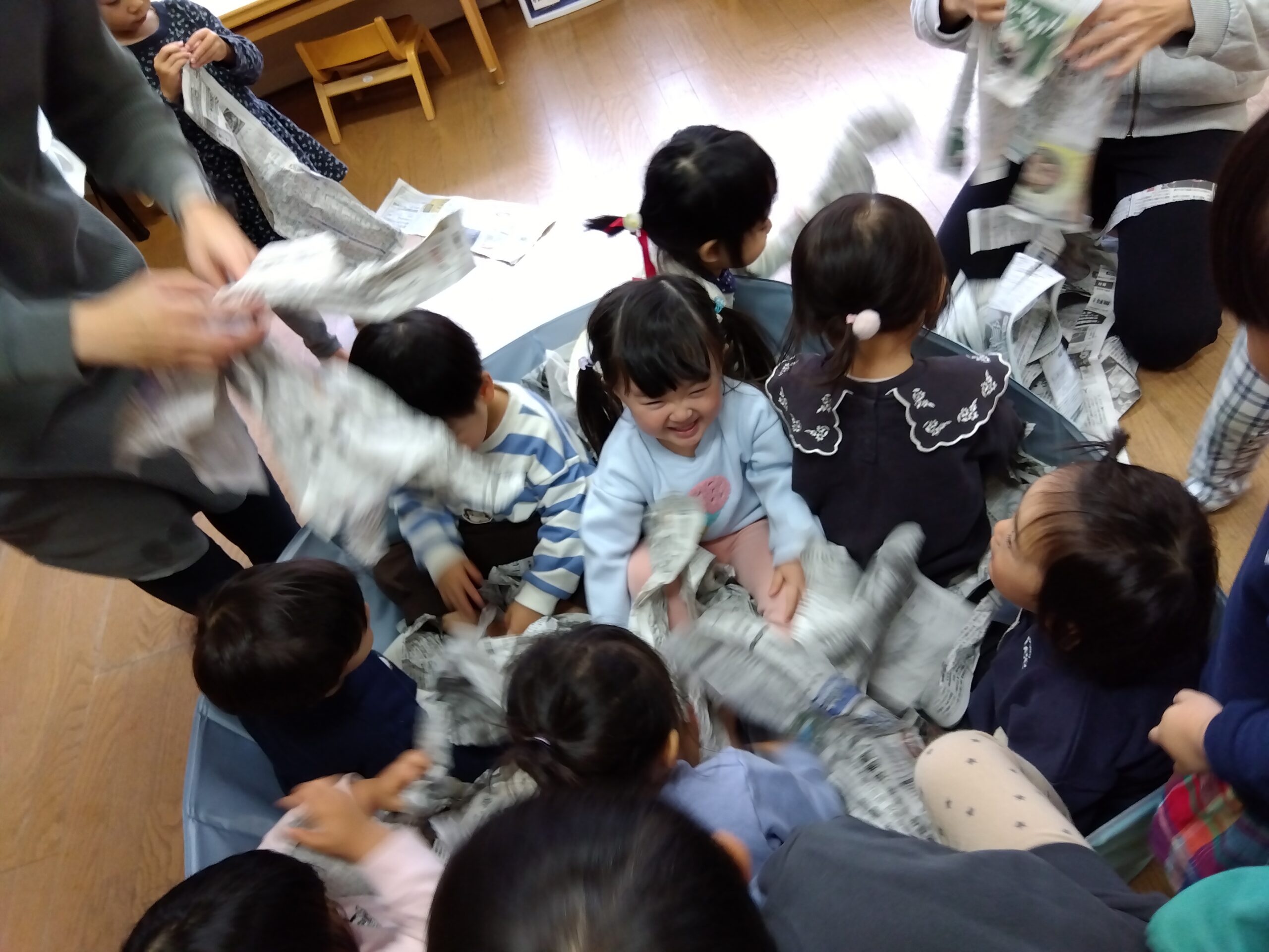 🐥新聞紙遊び 投稿日: 2025/11/25 カテゴリー: 園長日記 今日は雨だったので、部屋で新聞紙遊びをしました。 大きなプールを使って、みんなでちぎった新聞紙をたくさん入れて“新聞プール”が完成! 中に入ってバシャバシャしたり、新聞に埋まるのを楽しんだり、子どもたちは大喜びでした。 上に新聞紙をふわっと投げて、ひらひら落ちてくる様子を夢中に追いかけたり、「リボンが作りたい!」と前回の新聞紙遊びで教えてもらった蛇腹折りに挑戦している姿も。 同じ新聞紙でもそれぞれの楽しみ方があり、雨の日の部屋の中でも思いきり体を動かしながら楽しむ姿が見られました。 関連記事 🐥マーク探し 最近ひよこぐみでは、自由遊びのコーナーとしてブレスレットづくりを楽しんでいます。 するすると毛糸にストローやお花を通していき、「はい!できたよ!」と嬉しそうな子どもたち。 「家族のみんなにプレゼントしたい!」「これはママ... 投稿日: 2024/01/30 カテゴリー: 園長日記 2学期終業・クリスマス会 〈小さいひよこぐみ〉 小さいひよこ組では、帰りの用意が終わり後の机を見てみると、、、 さっきまでなかったプレゼントを見つけて興味津々の子どもたち。 みんなが大好きな機関車と新しいブロックが届き大喜びでした。 最後に先生と... 投稿日: 2023/12/22 カテゴリー: 園長日記 🐣🐰今学期もありがとうございました🍇 本日、2021年度2学期が終業しました。 そらぐみのページェントに合わせて、降園時間を変更して頂き、 ありがとうございました。 子どもたち、また保護者の皆様と共に、2学期を過ごせましたことを感謝いたします。 3学期もどう... 投稿日: 2021/12/16 カテゴリー: 園長日記