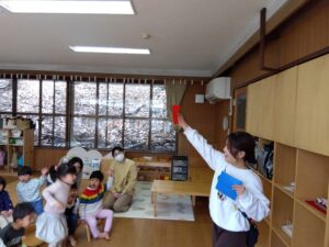 今日は、生活発表発表会で歌った「雪のペンキ屋さん」を歌ったり、色さがしゲームをしたりして楽しみました。