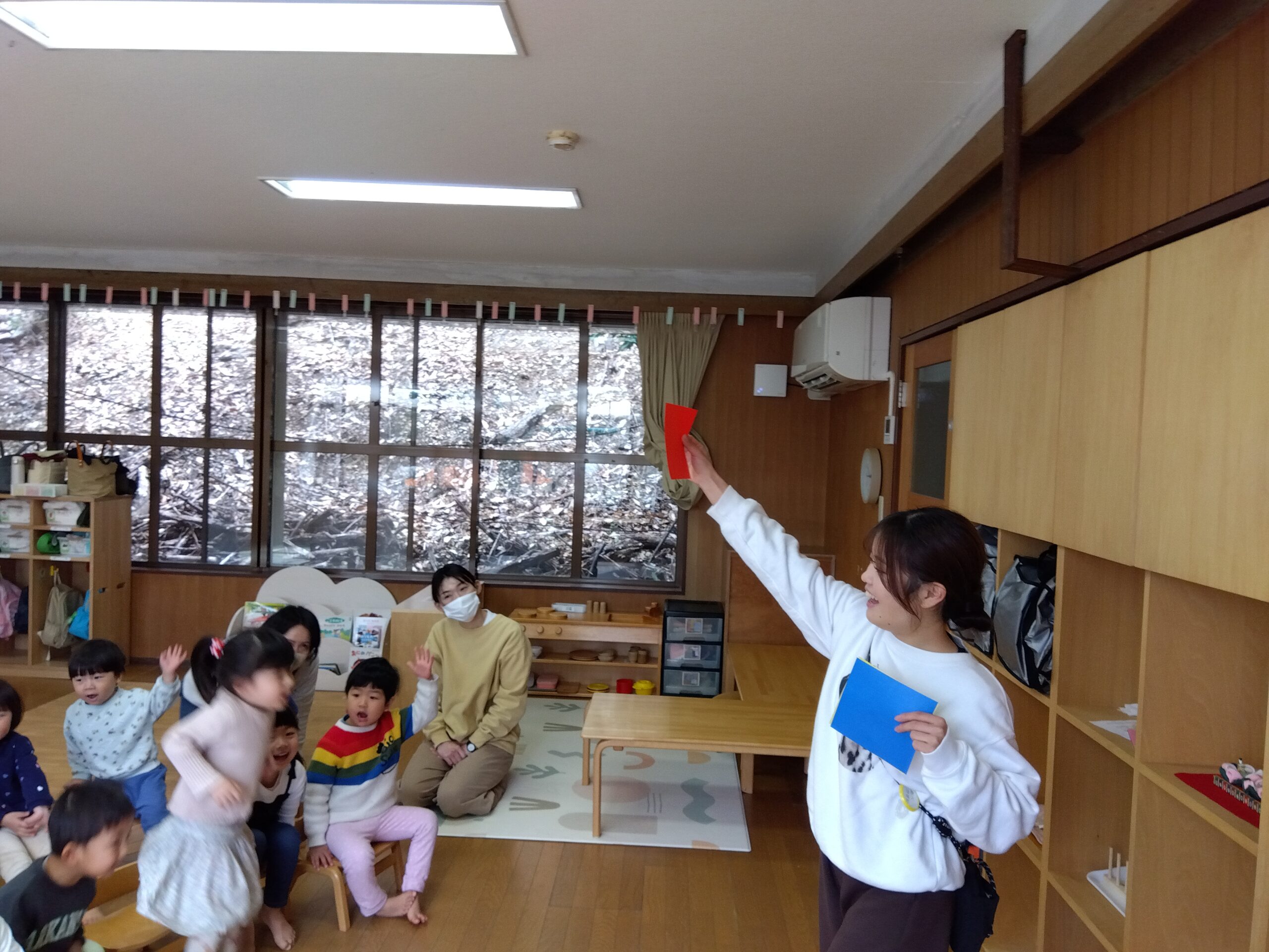 部屋の中から先生が出した折り紙の色と同じ色のものを探して持ってくるというゲームです。